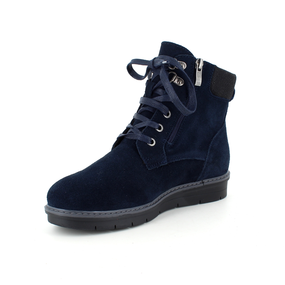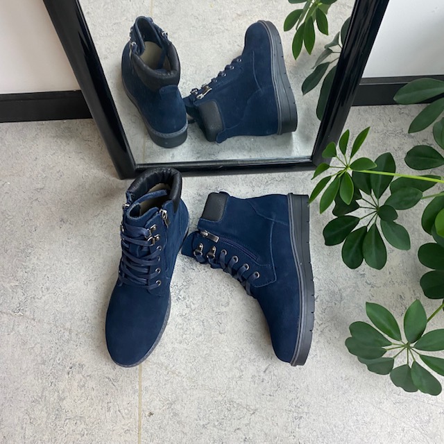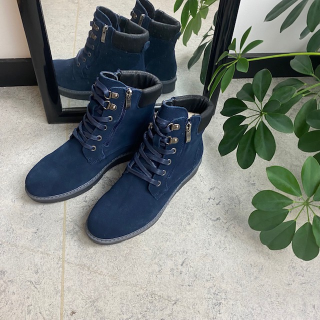 Navy skindstøvle med lynlås i begge sider, som gør den nem at komme i.