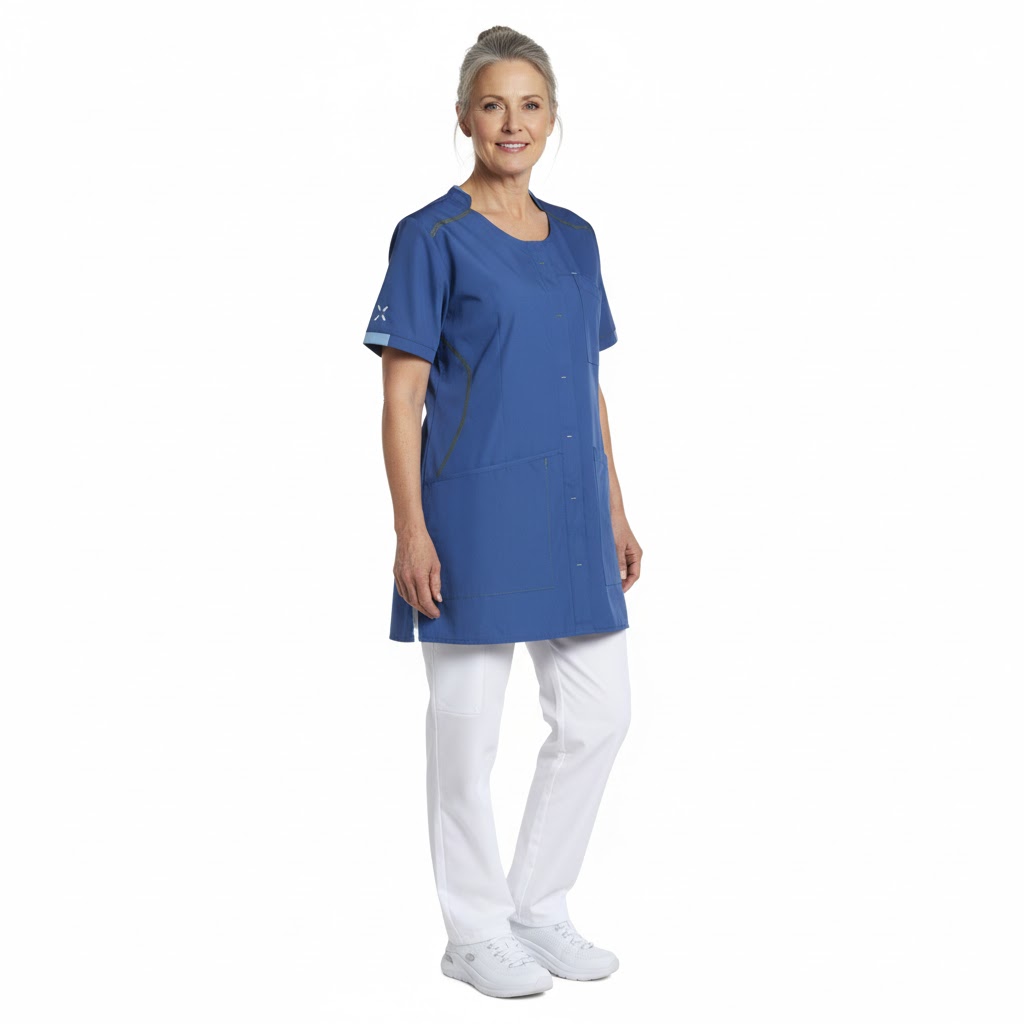 Denne smagfulde tunika fra Nybo Workwear A/S er perfektioneret til den moderne kvinde, der ønsker både stil og funktionalitet. Med en let taljering, som kan justeres yderligere ved en smart funktion i ryggen, sikrer denne sporty tunika en perfekt pasform. Dens rummelige brystlomme, nøglestropper og integrerede mobillommer i begge hoftelommer giver både bekvemmelighed og sikkerhed, da alle lommer er udstyret med trykknapper, der holder indholdet sikkert. Tunikaen er designet med rundet bund og rib i siderne for øget fleksibilitet, hvilket gør den ideel til bevægelse, uanset om du bukker dig ned eller løfter armene.