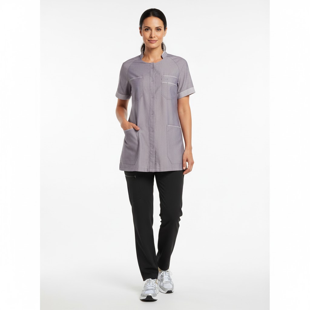 For at imødekomme arbejdsdagens krav er tunikaen forsynet med to rummelige brystlommer, hvoraf den ene har en indvendig pen-strop og en udvendig strop til id-kort. De rummelige hoftelommer med trykknaplukning indeholder nøglestropper og dedikerede lommer til mobiltelefoner, hvilket gør det nemt at have alt ved hånden. Tunikaens længde er designet til at dække hofteområdet, og slidser i siden giver ekstra bevægelsesfrihed.