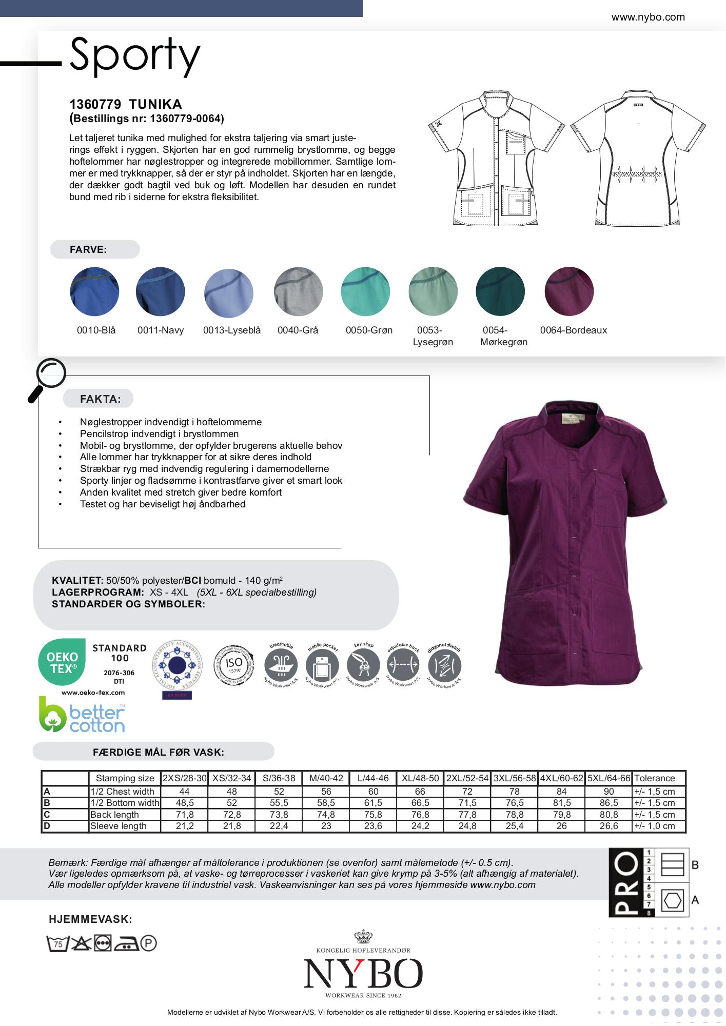 Nybo Bordeaux Dame Sporty Tunika er perfekt til kvinder, der søger en let taljeret og præcis pasform. Den har en unik justeringsmulighed i ryggen, som giver mulighed for ekstra taljering. Tunikaen byder desuden på rummelige lommer med nøglestropper og integrerede mobillommer, der alle lukkes med trykknapper, så du kan føle dig tryg ved, at dine ejendele er sikre. Tunikaens længde sørger for, at den dækker godt ved både bøj og løft, hvilket gør den ideel til en aktiv hverdag. Den runde bund og ribbede sider giver ekstra fleksibilitet og komfort.