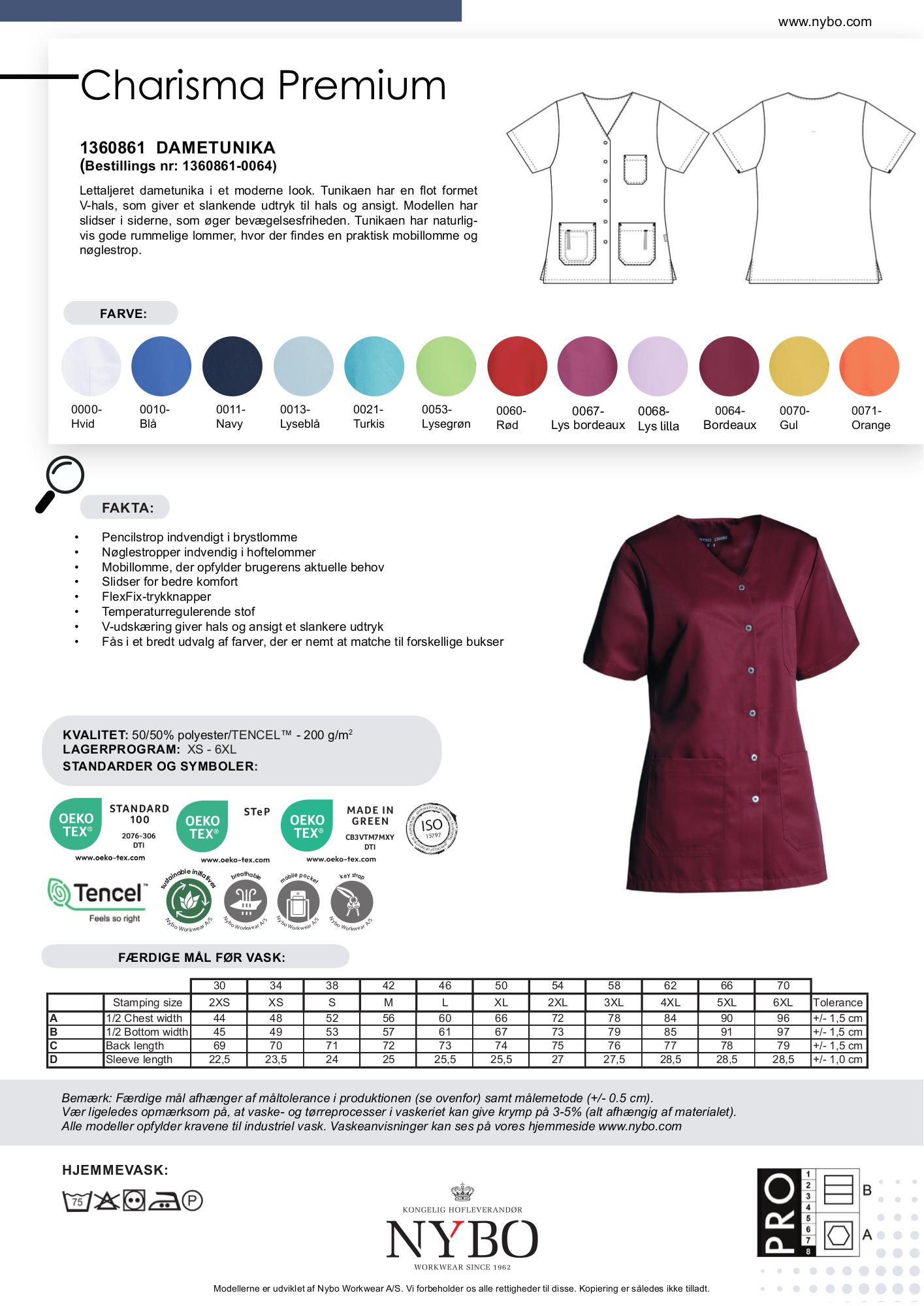 Charisma Premium-kollektionen byder på et friskt alternativ til den traditionelle hvide farve og kommer i en række livlige pastelfarver som hvid, blå, navy, lyseblå, turkis, lysegrøn, rød, lys bordeaux, lys lilla, gul og orange. Stoffet er ikke blot blødt og yderst komfortabelt, men også slidstærkt og permanent modstandsdygtig over for bakterier, hvilket reducerer svedlugt i tøjet. Med et minimalistisk nordisk design og en god pasform er tunikaerne fra denne kollektion perfekte til sundheds- og plejesektoren samt servicesektoren.