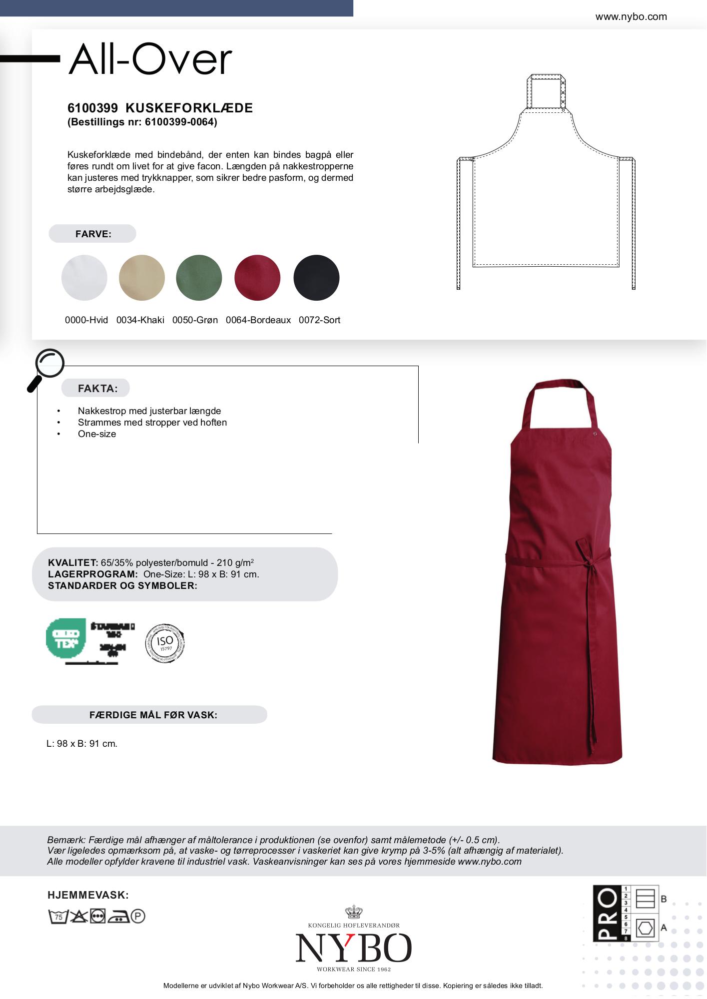 Med en kombination af 65% polyester og 35% bomuld, er stoffet på 210 g/m² både holdbart og behageligt at have på. Det er desuden one-size med målene H: 98 x B: 91 cm, hvilket gør det nemt at finde den rigtige pasform uden at gå på kompromis med komforten.
