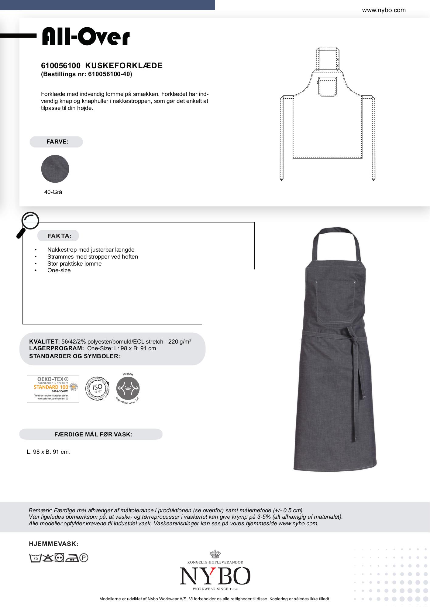 Materialet består af 56% polyester, 42% bomuld og 2% eol-stretch, hvilket sikrer både komfort og holdbarhed. Med en højde på 99 cm og en bredde på 91 cm, passer dette forklæde til de fleste brugere som ONE-SIZE.