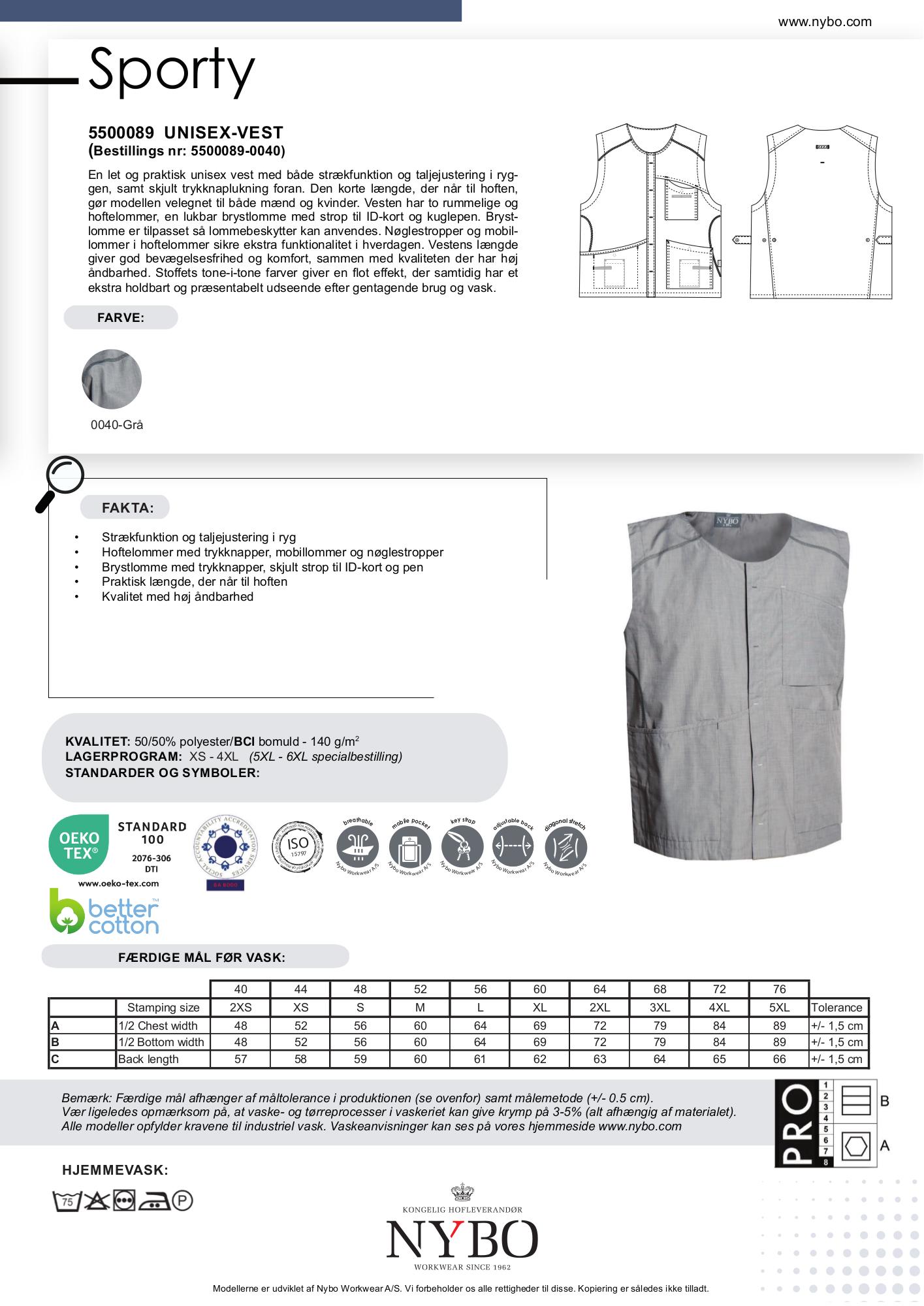 Vesten er udstyret med flere funktionelle lommer, herunder to rummelige hoftelommer med låsemulighed, mobillommer og nøglestropper. Derudover har den en brystlomme med skjult strop til ID-kort og pen, hvilket gør den ideel til arbejdssituationer, hvor praktiske opbevaringsløsninger er et must. Den skjulte trykknaplukning foran tilføjer et stilrent udtryk til den kortere længde, som gør vesten både præsentabel og brugervenlig.