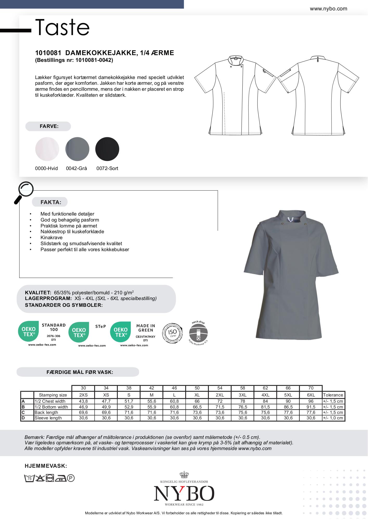 Nybo Grafit Dame Taste Kokkejakke er en ergonomisk udviklet kortærmet kokkejakke til kvinder, der kombinerer funktionalitet og komfort. Denne kokkejakke er ikke bare praktisk, men også stilfuld med sin figursyede pasform. Jakken har korte ærmer og en praktisk pencillomme på venstre ærme samt en strop i nakken til at hænge et kuskeforklæde. Fremstillet i en slidstærk og smudsafvisende blanding af 65% polyester og 35% bomuld, vejer materialet 210 g/m², hvilket sikrer maksimal holdbarhed og komfort i et hektisk køkkenmiljø.