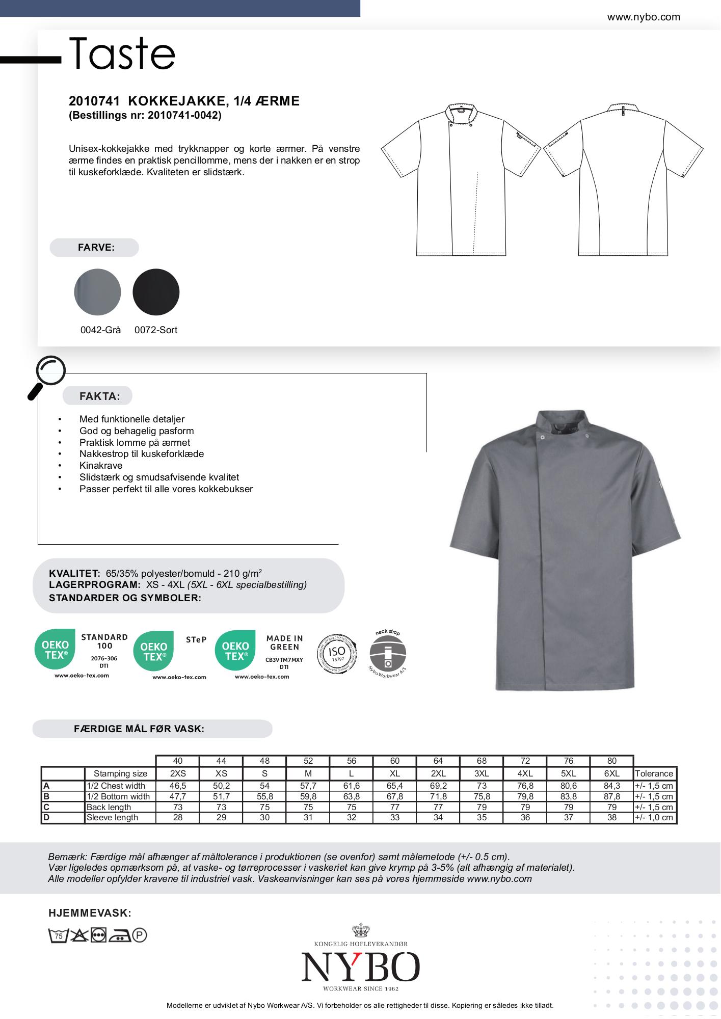 Nybo Workwear A/S præsenterer Nybo Grafit Unisex Taste Kokkejakke, en stilfuld og slidstærk kortærmet kokkejakke, der kombinerer funktionalitet og komfort. Denne unisex-jakke er udstyret med trykknapper, der gør det nemt at tage den af og på, mens de korte ærmer giver optimal bevægelsesfrihed i køkkenet. En specialdesignet pencillomme på venstre ærme sikrer, at du altid har dine redskaber lige ved hånden, og stroppen i nakken gør det enkelt at fastgøre et kuskeforklæde. Jakken er fremstillet i en slidstærk og smudsafvisende polyester/bomuldsblanding, der sikrer langvarig holdbarhed.