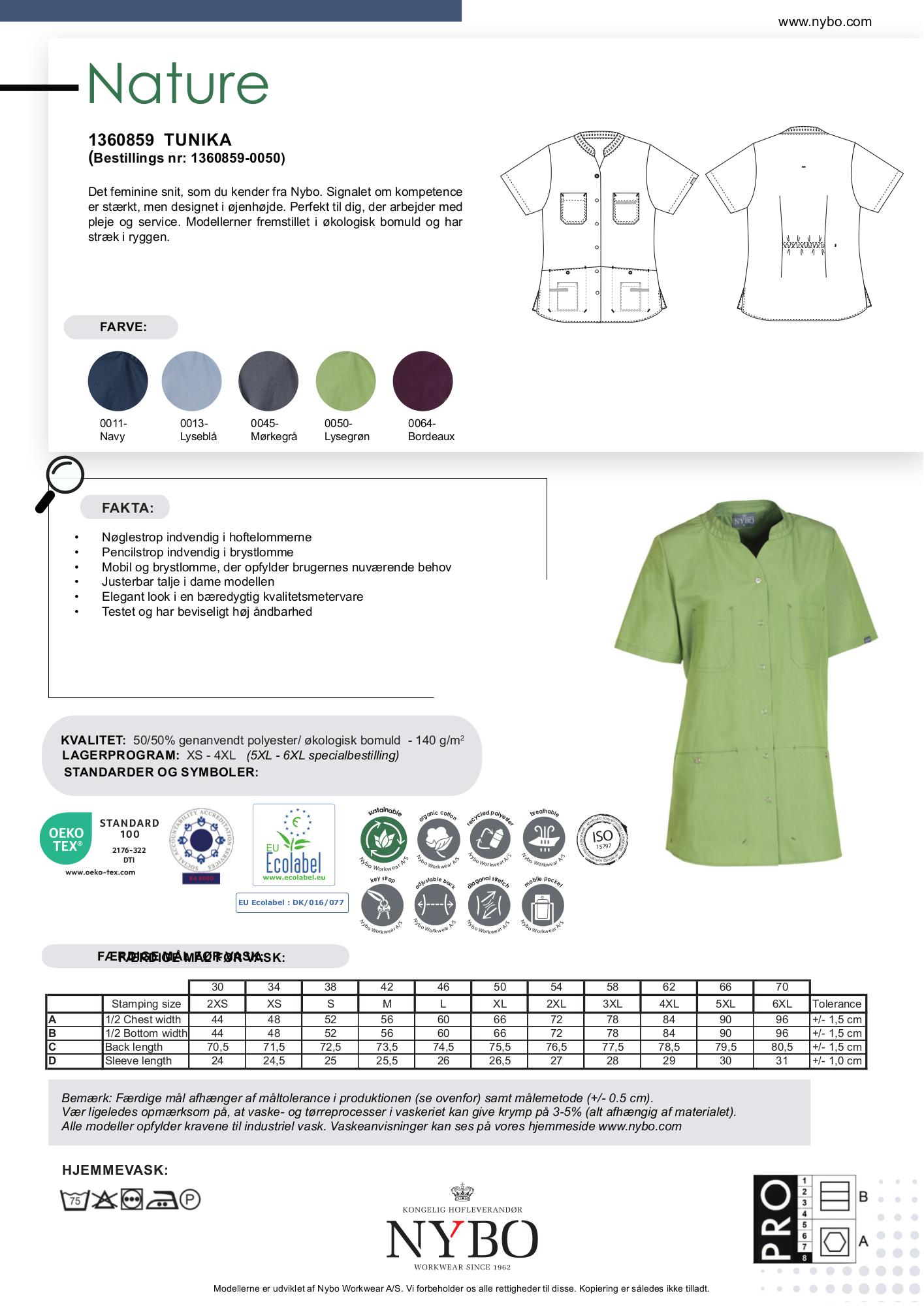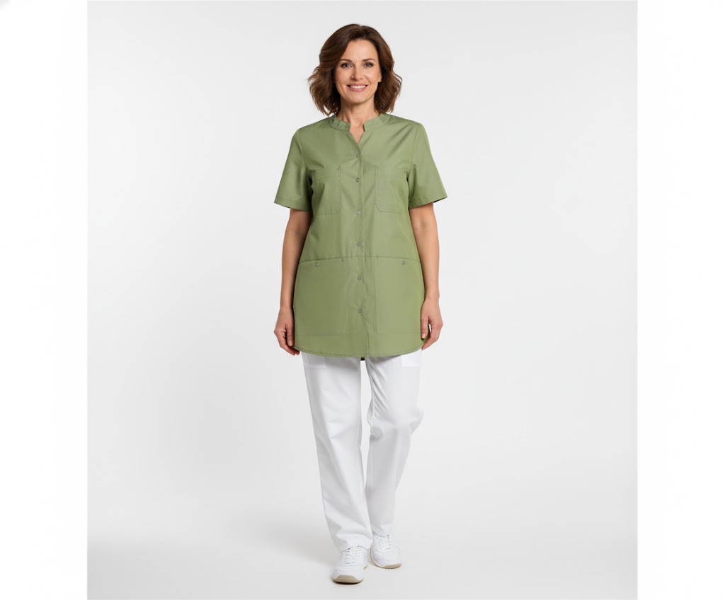 Kollektionen kombinerer slidstærkt genbrugs-polyester og økologisk bomuld i diskrete farver. Dette design skaber en følelse af faglighed og venlighed, som er ideel til professioner inden for pleje og service. Udover den grønne variant fås tunikaen også i farverne navy, lyseblå, koksgrå og bordeaux, så du kan vælge den der bedst matcher din stil og arbejdsmiljø.