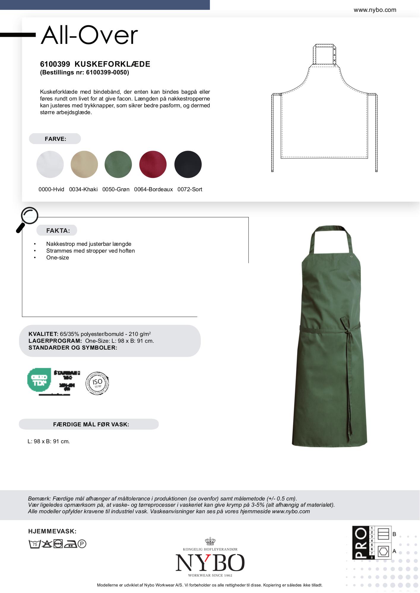 Forklædet kommer i en frisk grøn farve, men kan også vælges i hvid, khaki, bordeaux eller sort, hvilket giver dig mulighed for at matche med din arbejdsuniform eller køkkenindretning. Uanset hvilken farve du vælger, vil det slanke design og slidstærke materiale (65/35% polyester/bomuld blend på 210 g/m²) sikre, at du ser professionel ud, mens du udfører dine opgaver.
