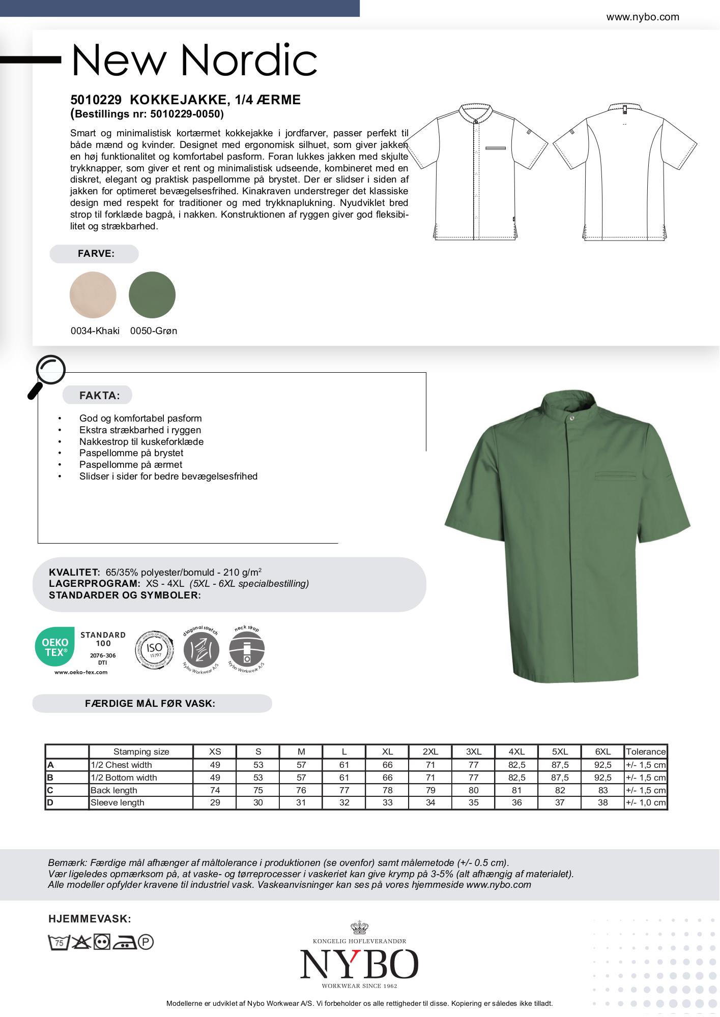Den unisex kokkejakke fra Nybo Workwear A/S er en kortærmet variant designet med både stil og funktionalitet i tankerne. Kokkejakken fås i en flot grøn farve, der komplementerer dens ergonomiske og strækbare design, og matcher sæsonens bedste farver i køkkenet. Med en minimalistisk og smart stil, er denne kokkejakke det perfekte valg for både mænd og kvinder. Foran findes skjulte trykknapper, der giver et rent og elegant udseende, kombineret med en praktisk paspellomme på brystet og ærmet. Slidserne i siderne sikrer optimal bevægelsesfrihed, mens den klassiske kinakrave, med trykknaplukning, understreger det traditionsrige design. Den nyudviklede brede strop bagpå giver mulighed for at fastholde forklædet solidt på plads.