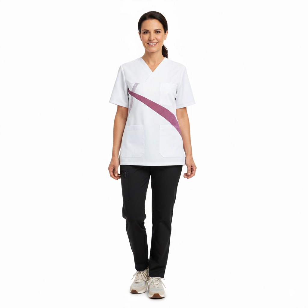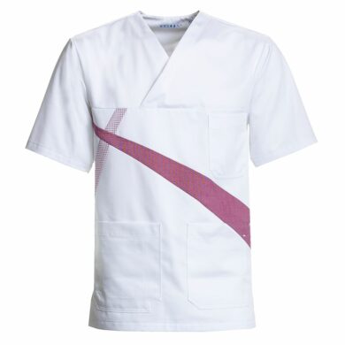 Comfortec Satin-kollektionen er skabt med en særlig vægt på komfort og holdbarhed, hvor bomuldsandelen er høj på indersiden for en blød fornemmelse mod huden. De hvide overdeler med en frisk, tværgående bordeauxfarvet stribe kombineret med et bordeauxfarvet ternet mønster på den anden led giver en moderne og professionel stil. Denne serie er perfekt til CI-beklædning, da de farverige detaljer kan tilpasses virksomhedens logo.