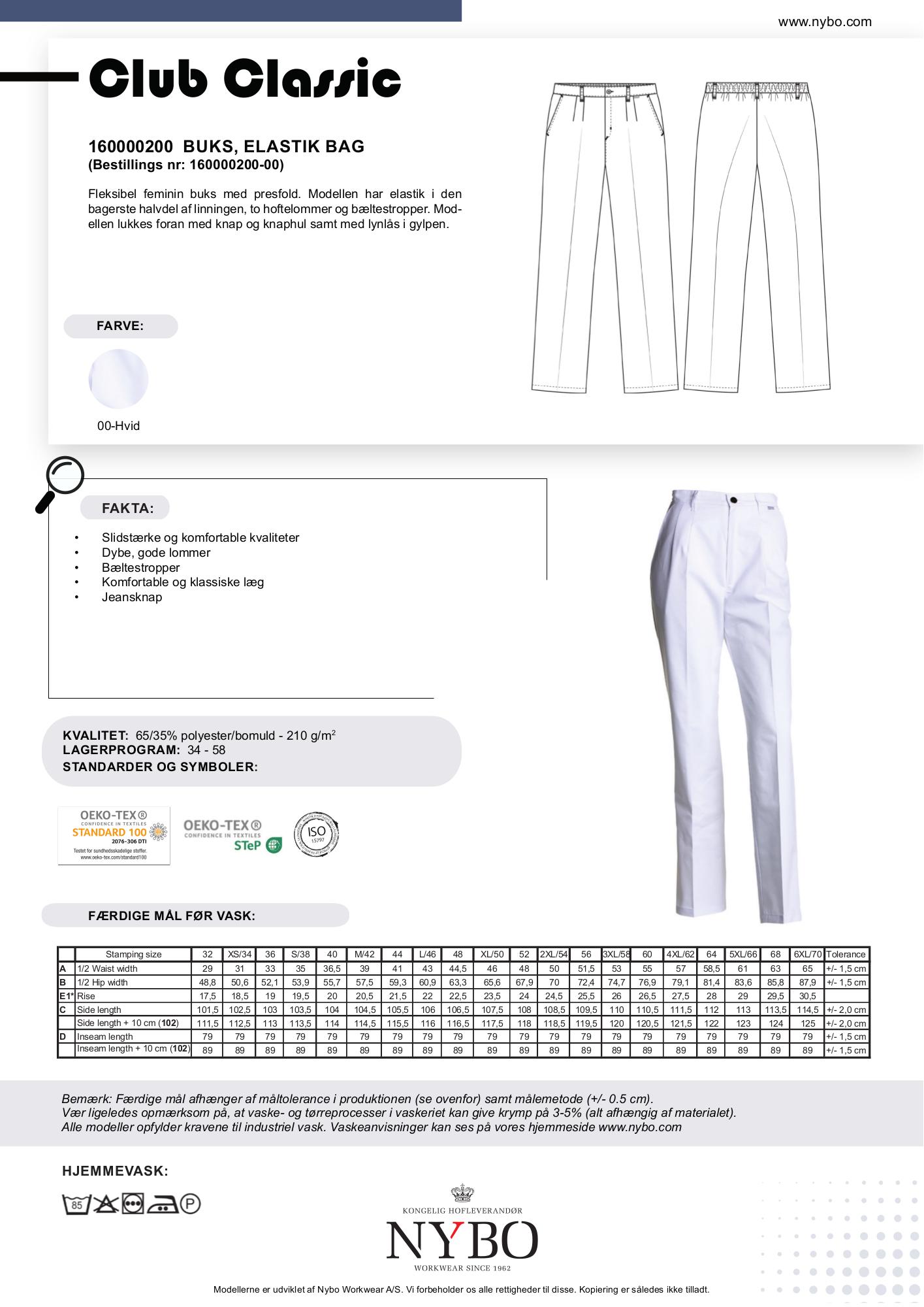Denne fleksible og feminine buks fra Nybo Workwear A/S, kendt som Nybo Hvid Dame Club-Classic Buks med elastik bag, er designet med komfort og elegance i tankerne. Bukserne har en praktisk elastik i den bageste halvdel af linningen, som sikrer en behagelig pasform hele dagen. To rummelige hoftelommer og bæltestropper tilføjer funktionalitet, mens lukningen foran består af knap og knaphul samt en lynlås i gylpen.