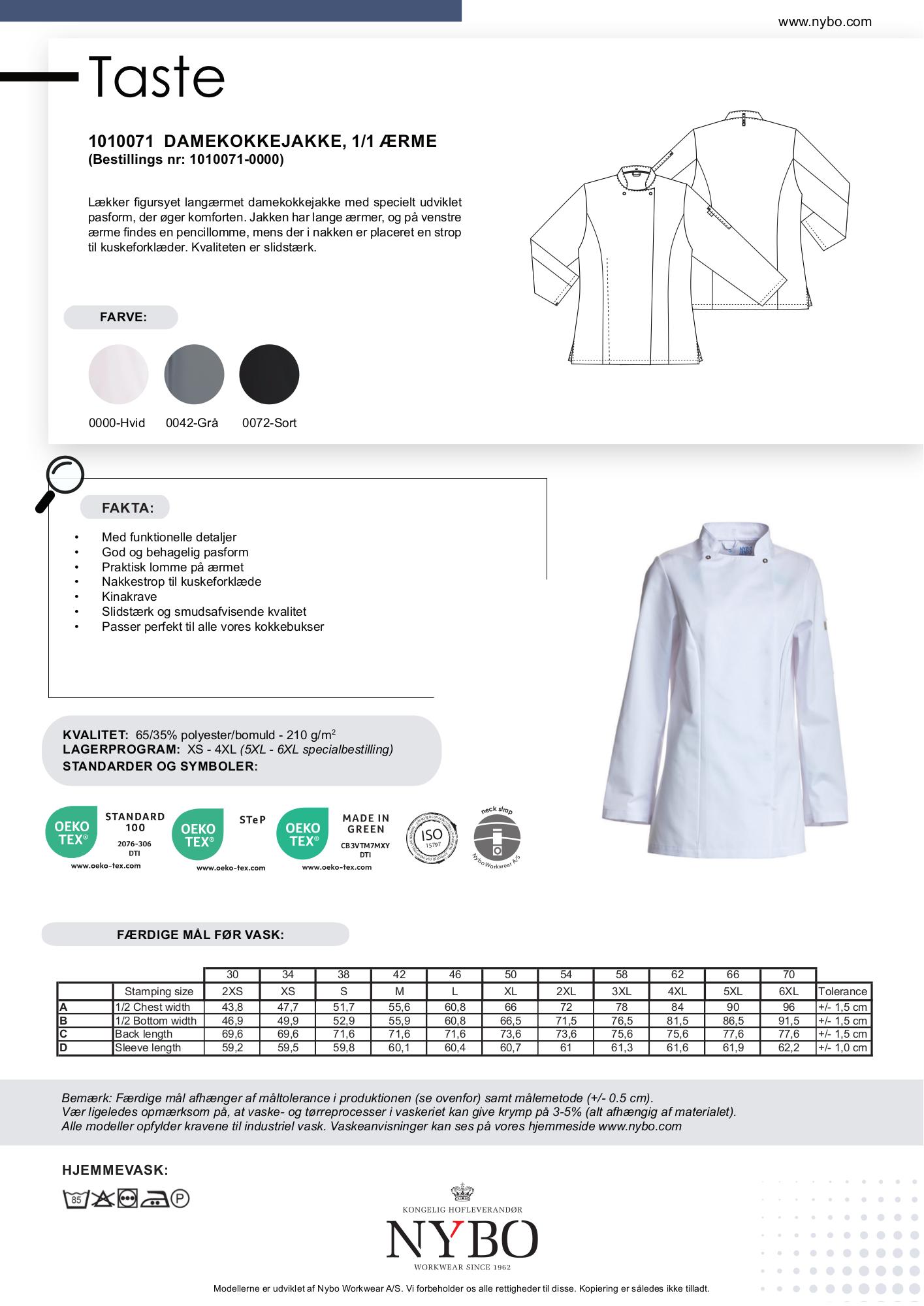 Nybo Hvid Damekokkejakke Taste, Langærmet, Komfort, Slidstærk