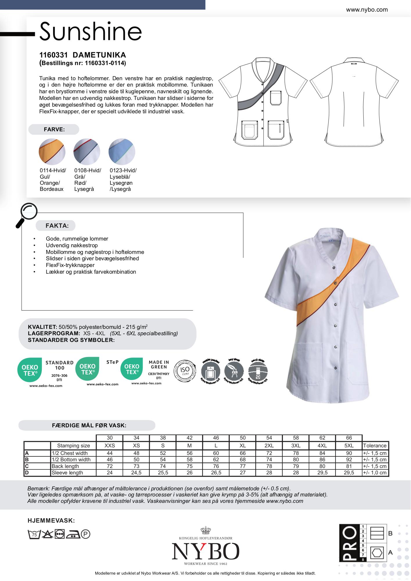 Oplev komfort og funktionalitet med denne elegante dametunika fra Nybo Workwear A/S. Denne hvid-gule Sunshine tunika er kortærmet og designet specielt til kvinder, hvilket giver optimal bevægelsesfrihed med slidser i siderne. Med to rummelige hoftelommer, hvor den venstre indeholder en smart nøglestrop, og den højre indeholder en praktisk dobbeltlomme, er det let at holde styr på dine nødvendigheder. En brystlomme på venstre side gør det nemt at gemme kuglepenne, navneskilte og lignende, mens en udvendig nakkestrop tilføjer ekstra bekvemmelighed. Fronten lukkes med trykknapper, der er specielt designet til industriel vask, hvilket gør denne tunika utroligt praktisk i daglig brug.