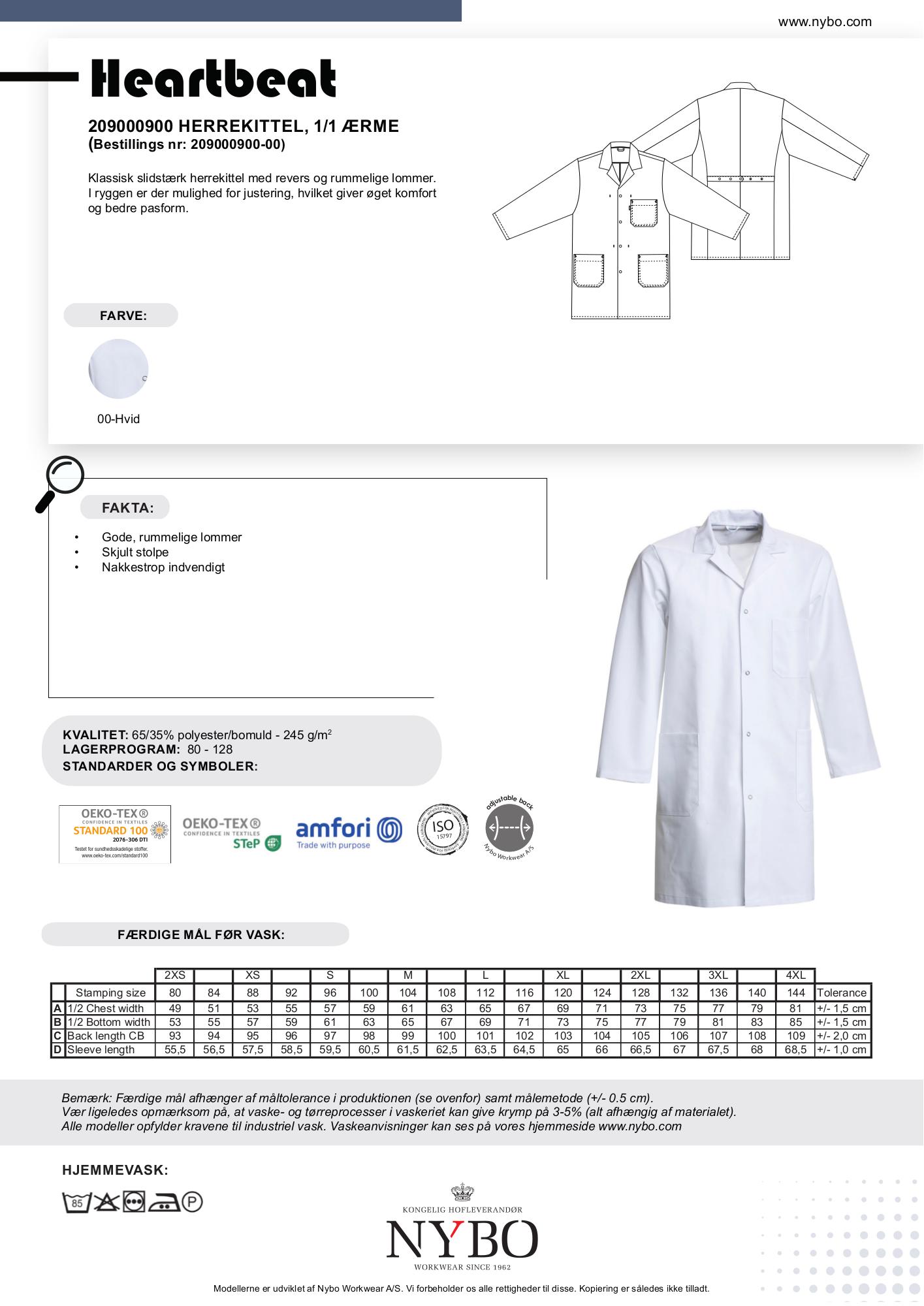 Nybo Hvid Herre Heartbeat Kittel, Revers, Slidstærk, Justerbar