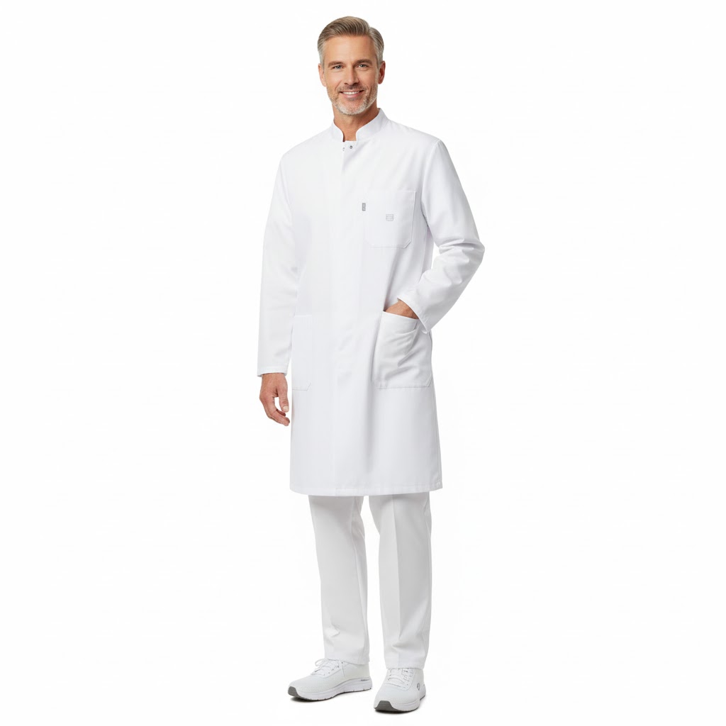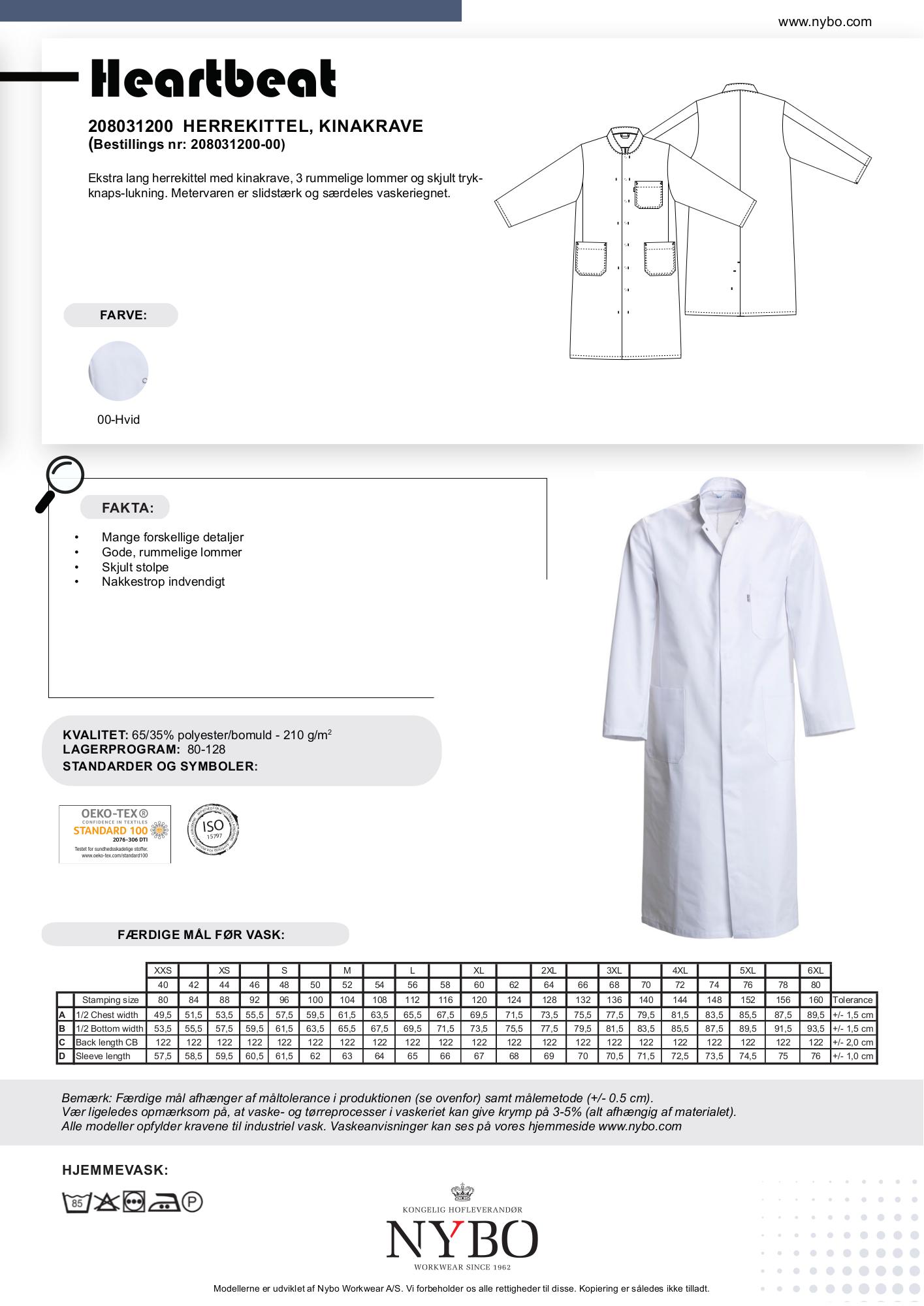Nybo Hvid Herrekittel Heartbeat med kinakrave er en ekstra lang herrekittel, der tilbyder både stil og funktionalitet. Denne kittel er forsynet med tre rummelige lommer og en skjult trykknapslukning, hvilket gør den både praktisk og æstetisk tiltalende. Materialet, bestående af en blanding af polyester og bomuld, er særligt slidstærkt og ideelt til hyppig vask, hvilket gør den perfekt til enhver arbejdsdag, hvor hygiejne og holdbarhed er i højsædet.