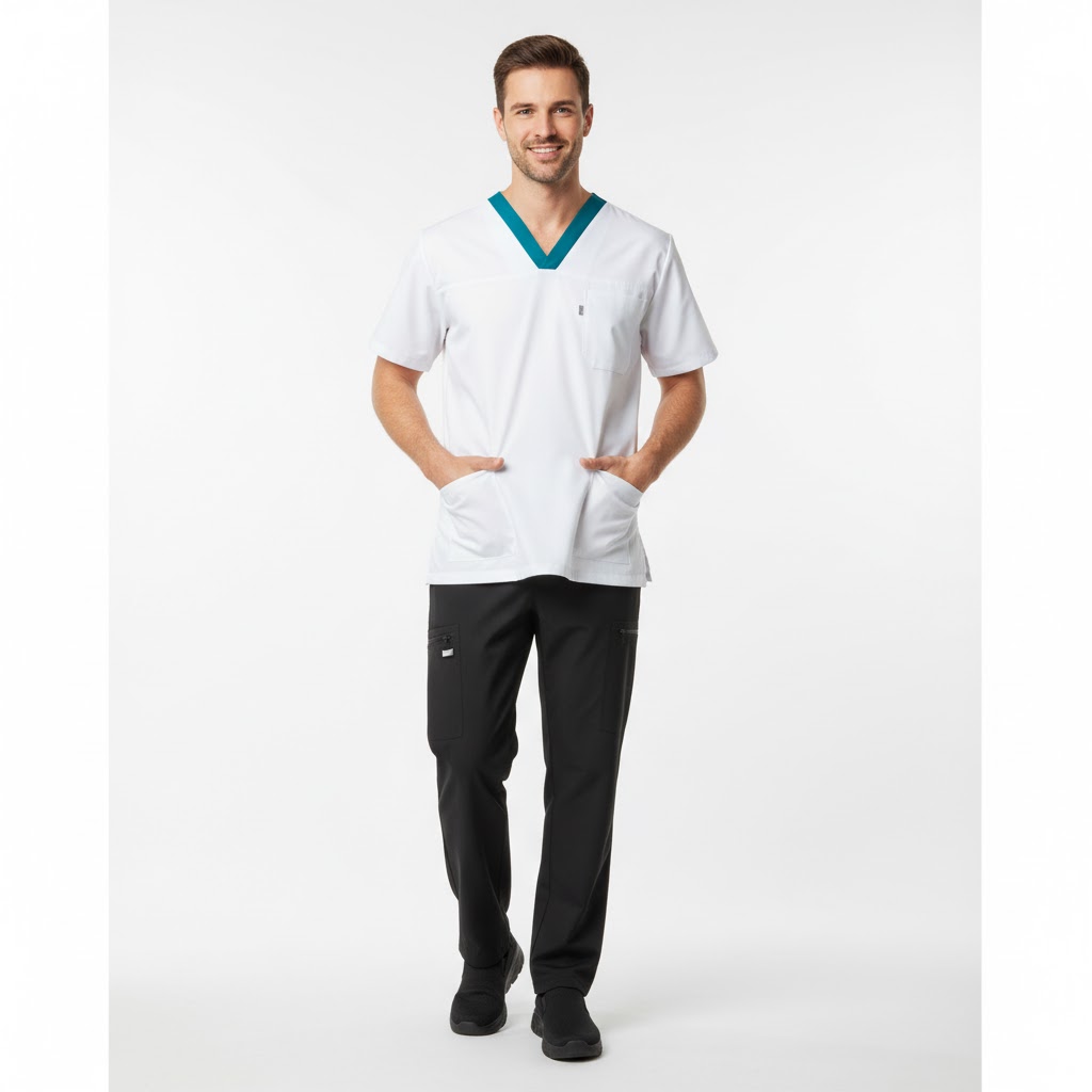 Kollektionen er en del af en alsidig hvid serie med stilfulde farvede detaljer og spændende snit. Med ekstra bomuld på indersiden af stoffet opretholder denne busseronne en optimal komfort, især i pleje- og hospitalssektoren. Serieens design gør den også velegnet til CI-beklædning, da farvebesætningerne kan justeres efter firmaets logo og farver.