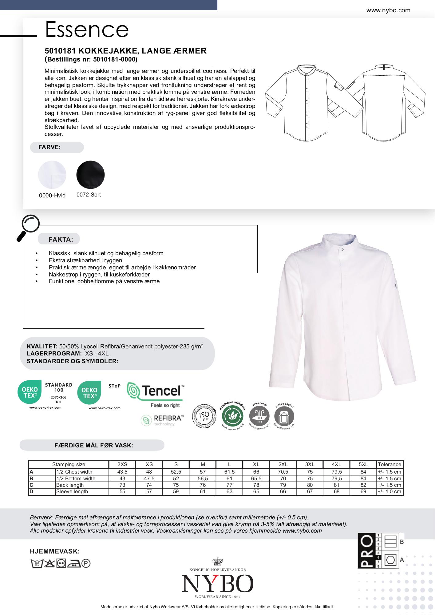 Essence kollektionen repræsenterer et bevidst valg med kokkejakker, bukser og forklæder, der kombinerer stil og bæredygtighed. Med fokus på råmaterialer og miljøvenlige produktionsprocesser, bringer denne kollektion et afbalanceret og stilrent look til køkkenet. Materialerne omfatter TENCEL™ Lyocell-fibre med REFIBRA™ teknologi, som kombinerer op til en tredjedel pre-consumer affald med bæredygtigt skovareal, hvilket viser en ny generation af bæredygtigt design. Produktet fås i både hvid og sort, så det nemt kan tilpasses forskellige arbejdsmiljøer og personlige præferencer.