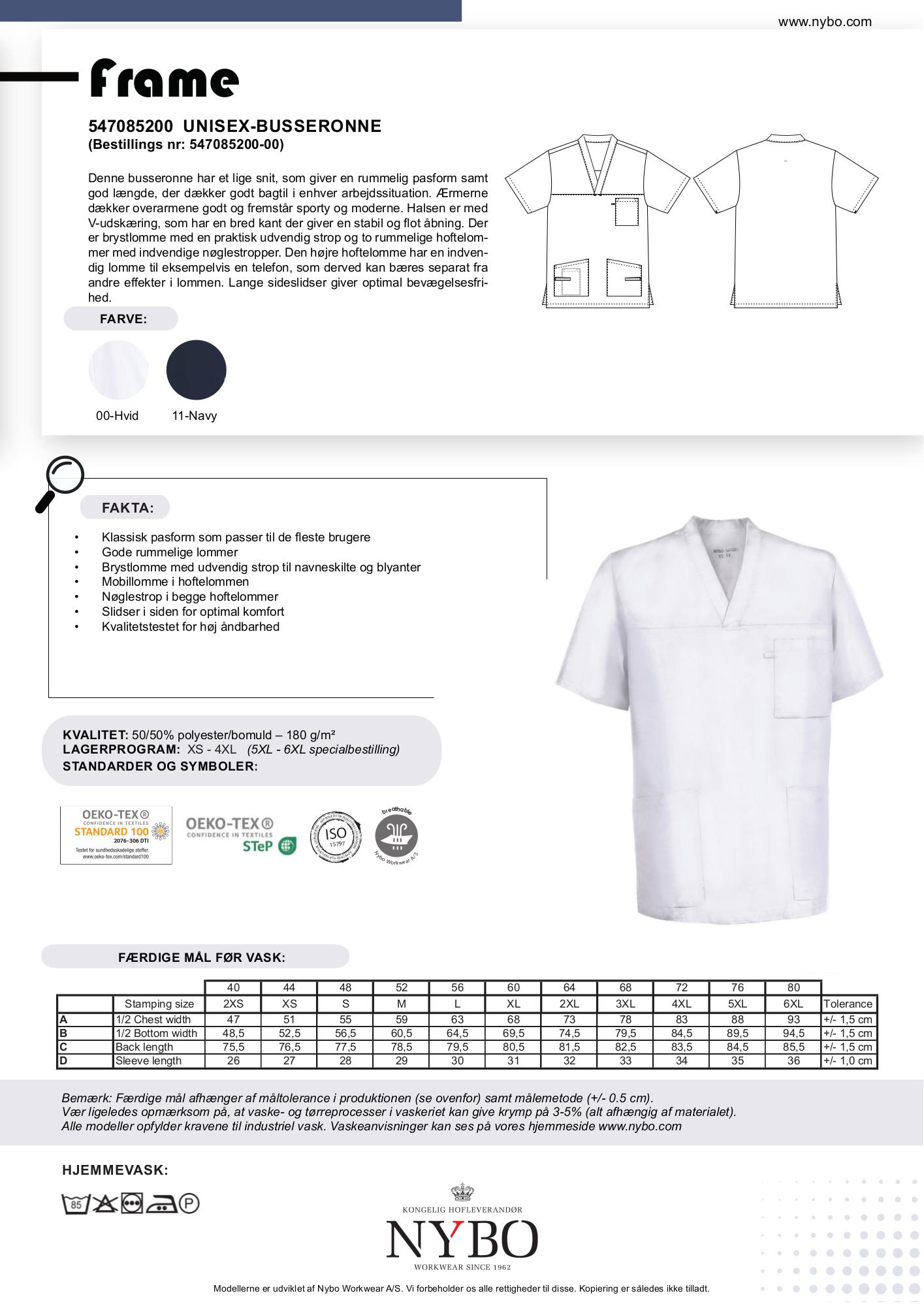 Frame-kollektionen tilbyder en enestående sammensætning af praktiske og enkle overdele, der opfylder de mange krav i sundhedssektoren. Det professionelle look og behagelige snit garanterer en optimal pasform hver gang. Kollektionen er fremstillet i materialer med høj åndbarhed og styrke, hvilket sikrer, at tøjet kan bæres hele året rundt, uanset arbejdets art. Du kan vælge mellem klassiske farver som hvid og navy, som let kan kombineres med forskellige bukser og nederdele i matchende kvaliteter.