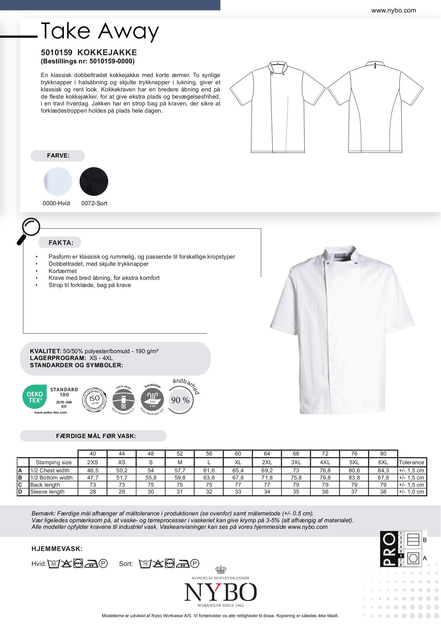 Nybo Workwear A/S præsenterer den uundværlige Nybo Hvid Unisex Take Away Kokkejakke. Denne kortærmede kokkejakke er designet til at levere både komfort og funktionalitet, perfekt til lange og travle dage i køkkenet. Den dobbeltradede konstruktion med skjulte trykknapper giver et stilfuldt og rent look, mens de synlige trykknapper ved halsåbningen tilføjer ekstra detaljer til designet. Kokkekraven er specielt designet med en bredere åbning for at give optimal bevægelsesfrihed og komfort, og en praktisk strop bag på kraven sørger for, at forklædestroppen forbliver på plads hele dagen.