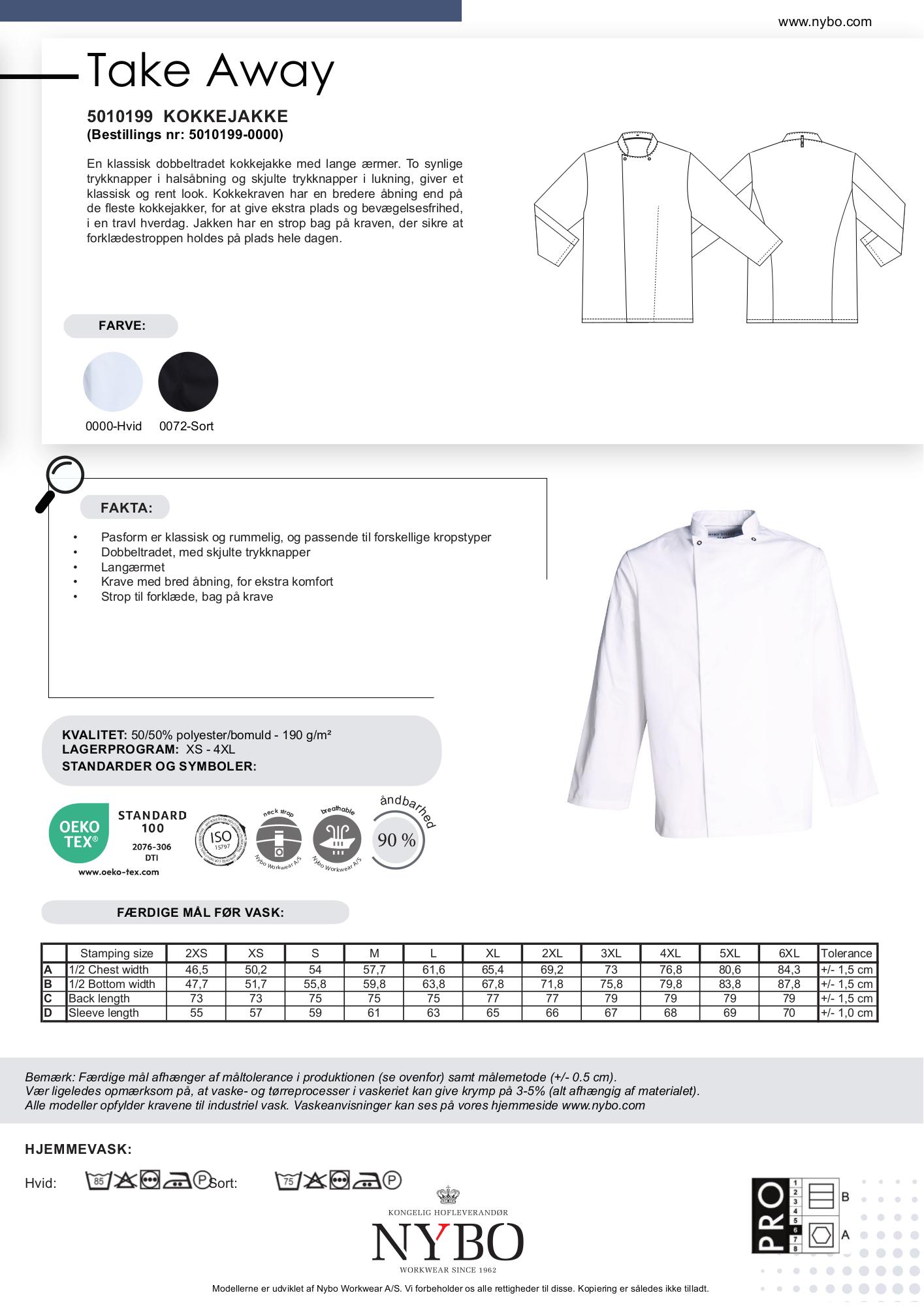 Den klassiske Nybo Hvid Unisex Take Away Kokkejakke fra Nybo Workwear A/S er designet med funktion og komfort i tankerne. Den dobbeltradede jakke har lange ærmer og to synlige trykknapper i halsåbningen samt skjulte trykknapper i lukningen, hvilket giver et rent og professionelt look. Kokkekraven er bredere end på de fleste traditionelle kokkejakker, hvilket giver ekstra plads og bevægelsesfrihed i en travl hverdag. En praktisk strop bag på kraven holder forklædestroppen på plads hele dagen, hvilket bidrager til en problemfri arbejdsdag.