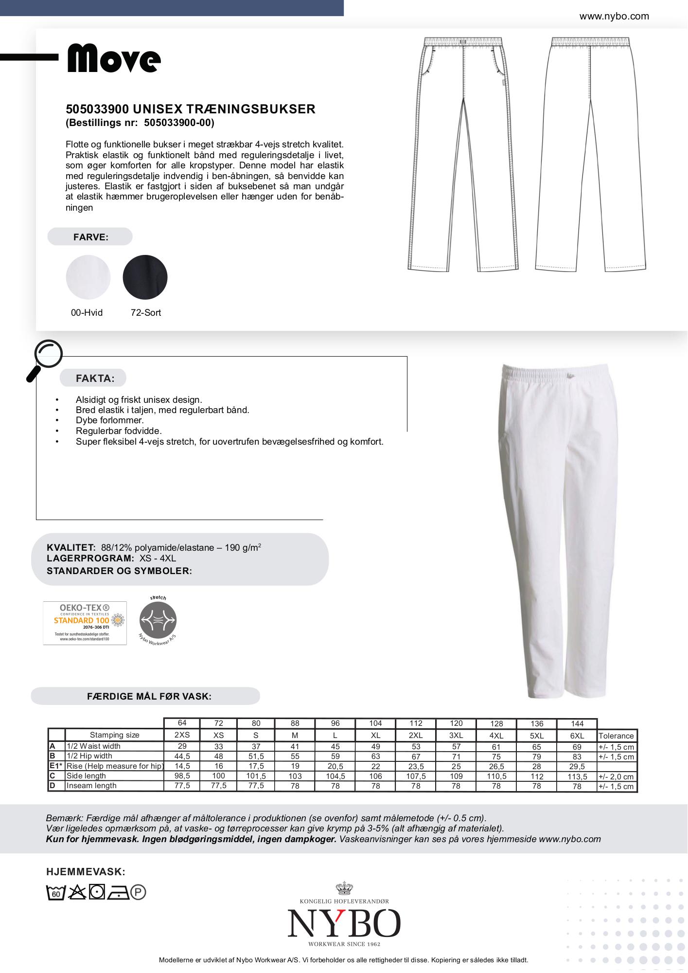 Nybo Hvide Unisex Move Træningsbukser er det perfekte valg for dig, der søger funktionalitet og komfort i ét. Disse bukser er fremstillet i en super strækbar 4-vejs stretch kvalitet, som giver dig uovertruffen bevægelsesfrihed. Designet er alsidigt og friskt unisex, med en bred elastik i taljen og regulerbart bånd, hvilket sikrer en perfekt pasform til alle kropstyper. De dybe forlommer øger praktikaliteten, og den regulerbare fodvidde gør, at du kan tilpasse bukserne til dit behov.