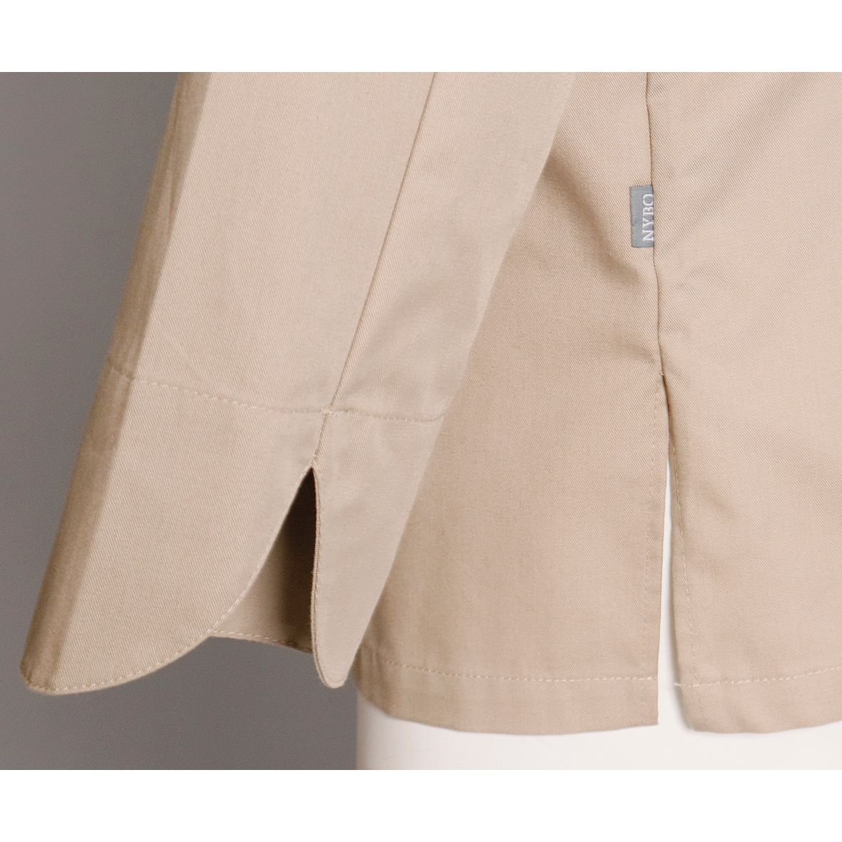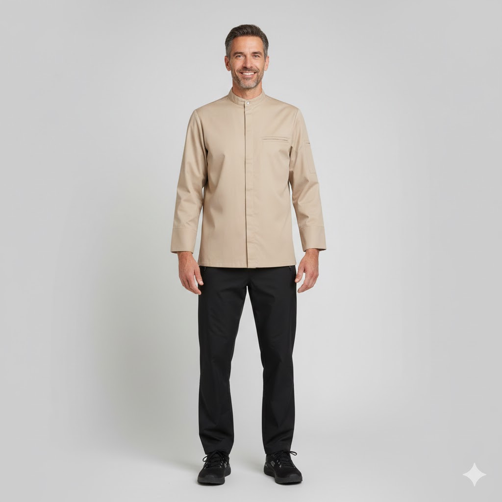 Denne langærmede kokkejakke fra Nybo Workwear A/S udstråler minimalistisk elegance og funktionalitet. Nybo Khaki Unisex New Nordic Kokkejakke er skabt til at passe både mænd og kvinder med sin ergonomiske silhuet, der sikrer høj komfort og optimal bevægelsesfrihed. Jakken har skjulte trykknapper foran, hvilket giver et rent og stilfuldt look, mens en diskret paspellomme på brystet tilføjer både elegance og praktisk anvendelighed. De indarbejdede slidser i siderne bidrager til fleksibilitet og bevægelsesfrihed, hvilket er afgørende i det travle køkken.