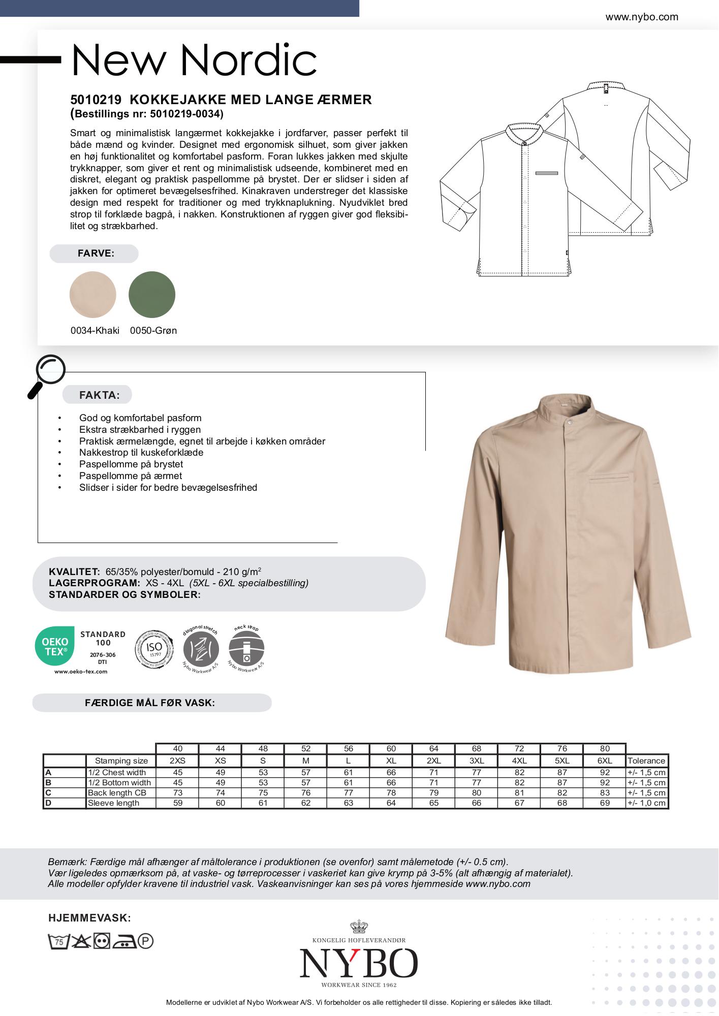 New Nordic kollektionen tilbyder et bredt udvalg af tøj til kokke og tjenere, herunder denne kokkejakke. Kollektionen tager inspiration fra den nordiske natur og traditioner med et minimalistisk design. Materialerne er nøje udvalgt for deres højteknologiske og bæredygtige egenskaber, herunder genanvendt polyester og økologisk bomuld. Farvepaletten omfatter friske hvide, khaki, grønne og brun/grønne toner samt dyb sort, som alle er inspireret af det rå nordiske miljø.