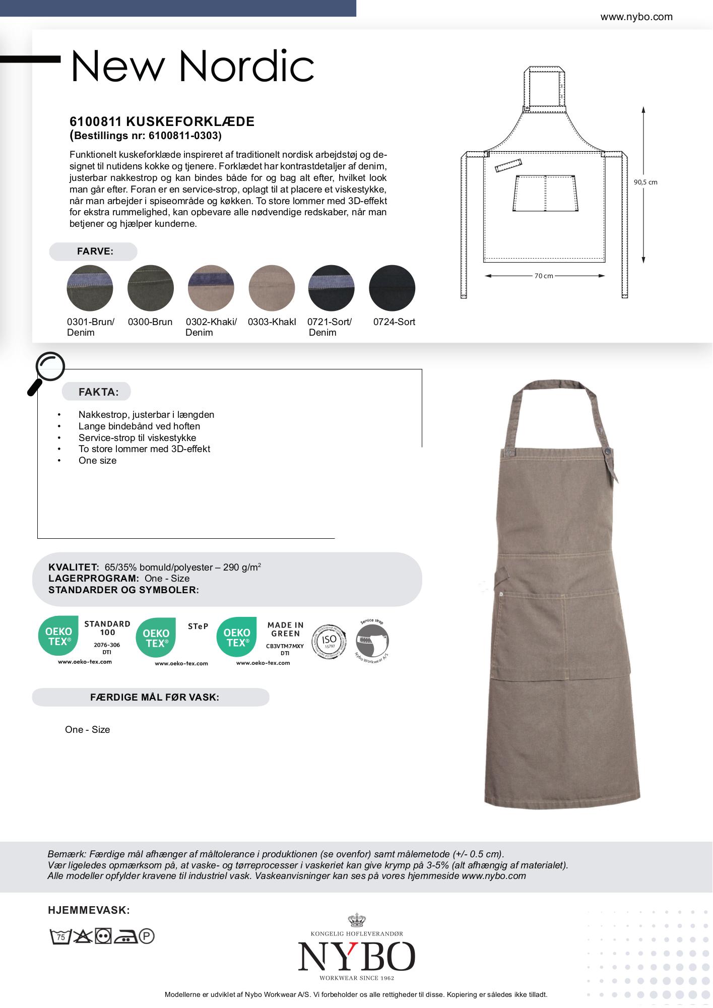 Dette forklæde er tilgængeligt i en række farvekombinationer: Brun/brun, Brun/denimblå, Khaki/denimblå, Sort/denimblå og Sort/sort. Materialet består af en holdbar blanding af 65% bomuld og 35% polyester med en vægt på 290 g/m².