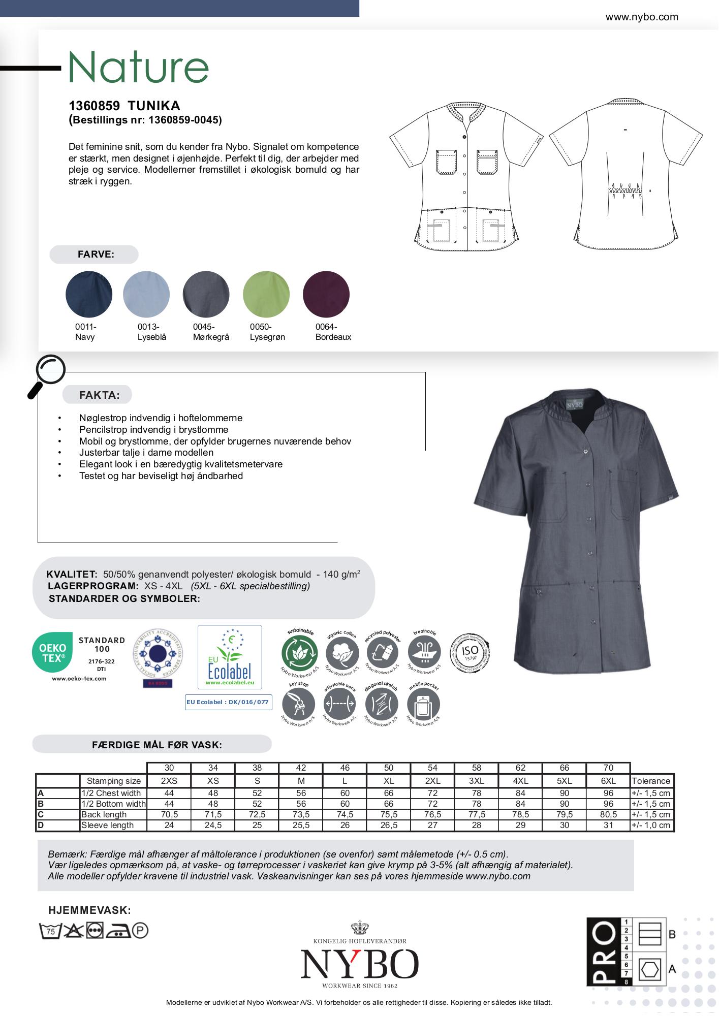 Denne smukke Nybo Koksgrå Dametunika Nature, fremstillet af Nybo Workwear A/S, er skabt med fokus på både stil og komfort. Tunikaen har et feminint snit og er designet til at udsende et signal om både kompetence og venlighed, hvilket gør den perfekt til dem, der arbejder inden for pleje- og servicefagene. Det økologiske bomuld og strækket i ryggen sikrer en behagelig pasform, og tunikaen passer perfekt med jeans.