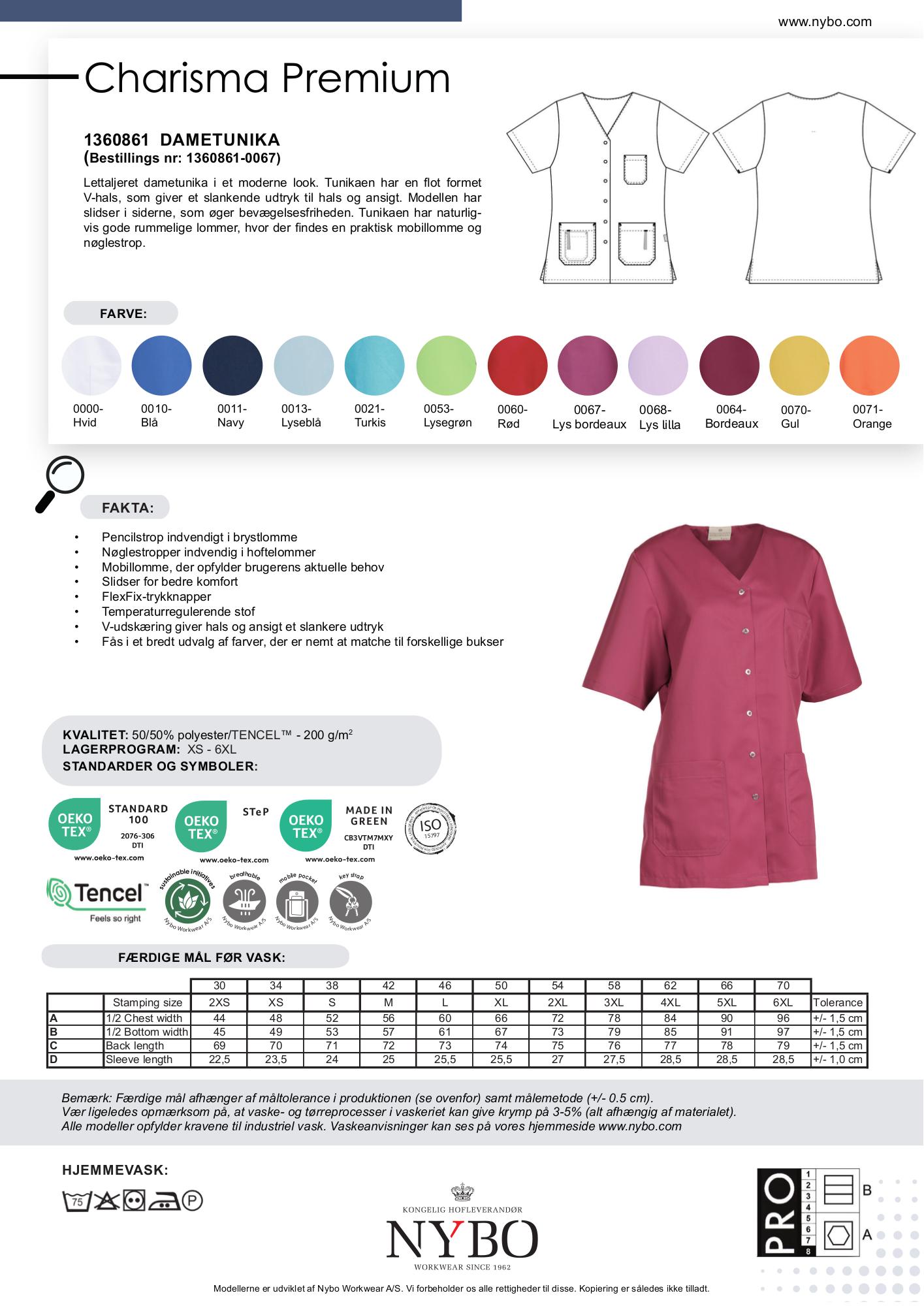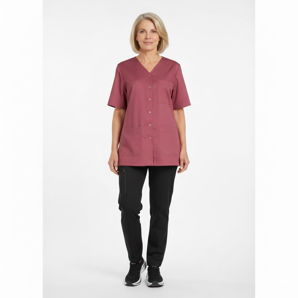 Ud over lys bordeaux findes tunikaen også i en bred vifte af farver som hvid, blå, navy, lyseblå, turkis, lysegrøn, rød, bordeaux, lys lilla, gul og orange, hvilket gør det nemt at matche den med forskellige bukser og skabe et muntert og farverigt udseende. Alle modeller opfylder naturligvis kravene til industriel vask og er skabt til at holde til daglig brug.