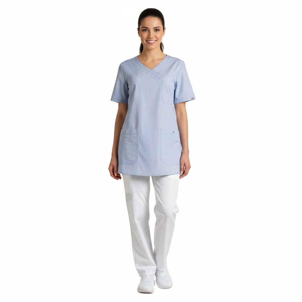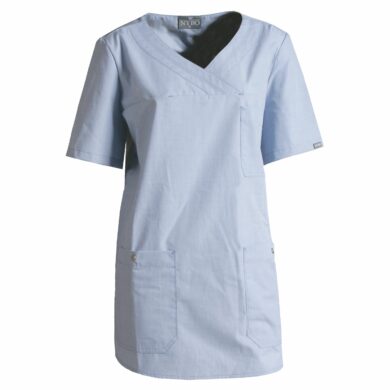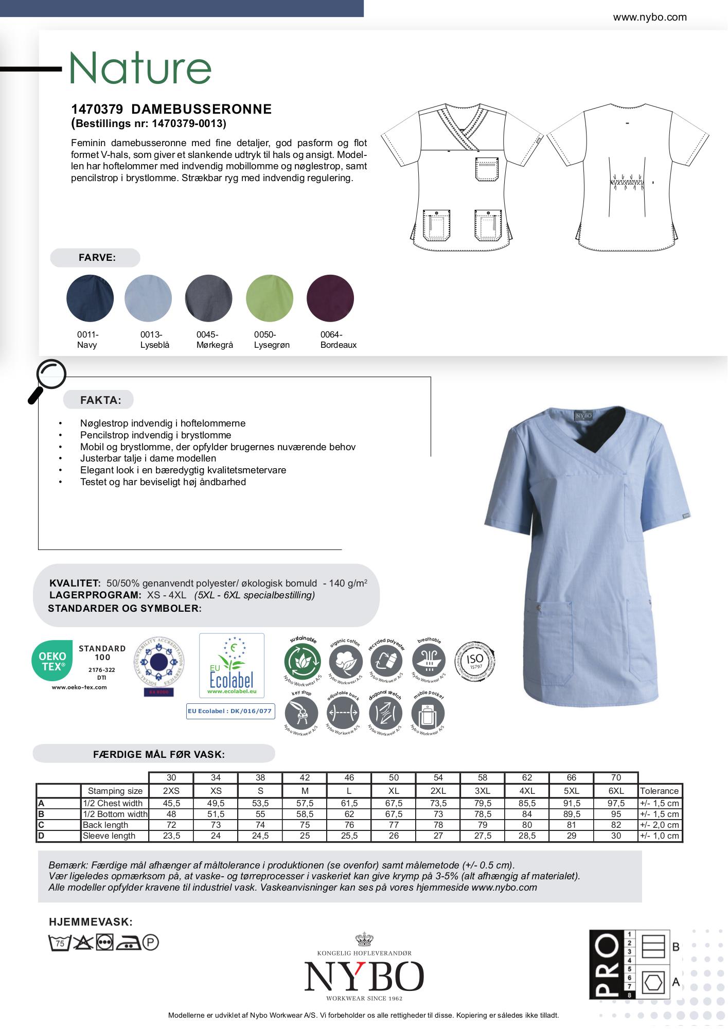 Kollektionen, der inkluderer denne damebusseronne, er kendt for sine diskrete farver og en slidstærk vævning bestående af 50% genanvendt polyester og 50% økologisk bomuld. Designet er perfekt til professionelle inden for pleje- og servicefagene og signalerer både faglighed og venlighed.