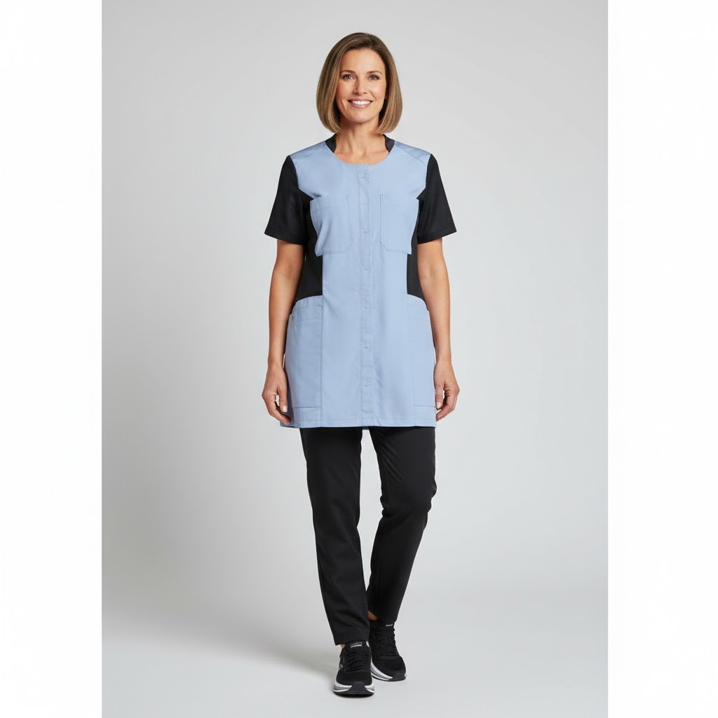 Nybo Workwear A/S præsenterer den elegante Nybo Lyseblå Dametunika Sporty Mix, en perfekt kombination af åndbarhed, komfort og strækbarhed. Tunikaen er let taljeret og har en skjult trykknapslukning samt en blød rib ved halsåbningen for ekstra komfort. Det geniale design med konstrueret stræk både foran og i ryggen sikrer stabilitet og en behagelig oplevelse gennem hele dagen. Den skjulte justering af talje-vidde i ryggen giver mulighed for en individuel pasform, der tilpasser sig perfekt til din krop.
