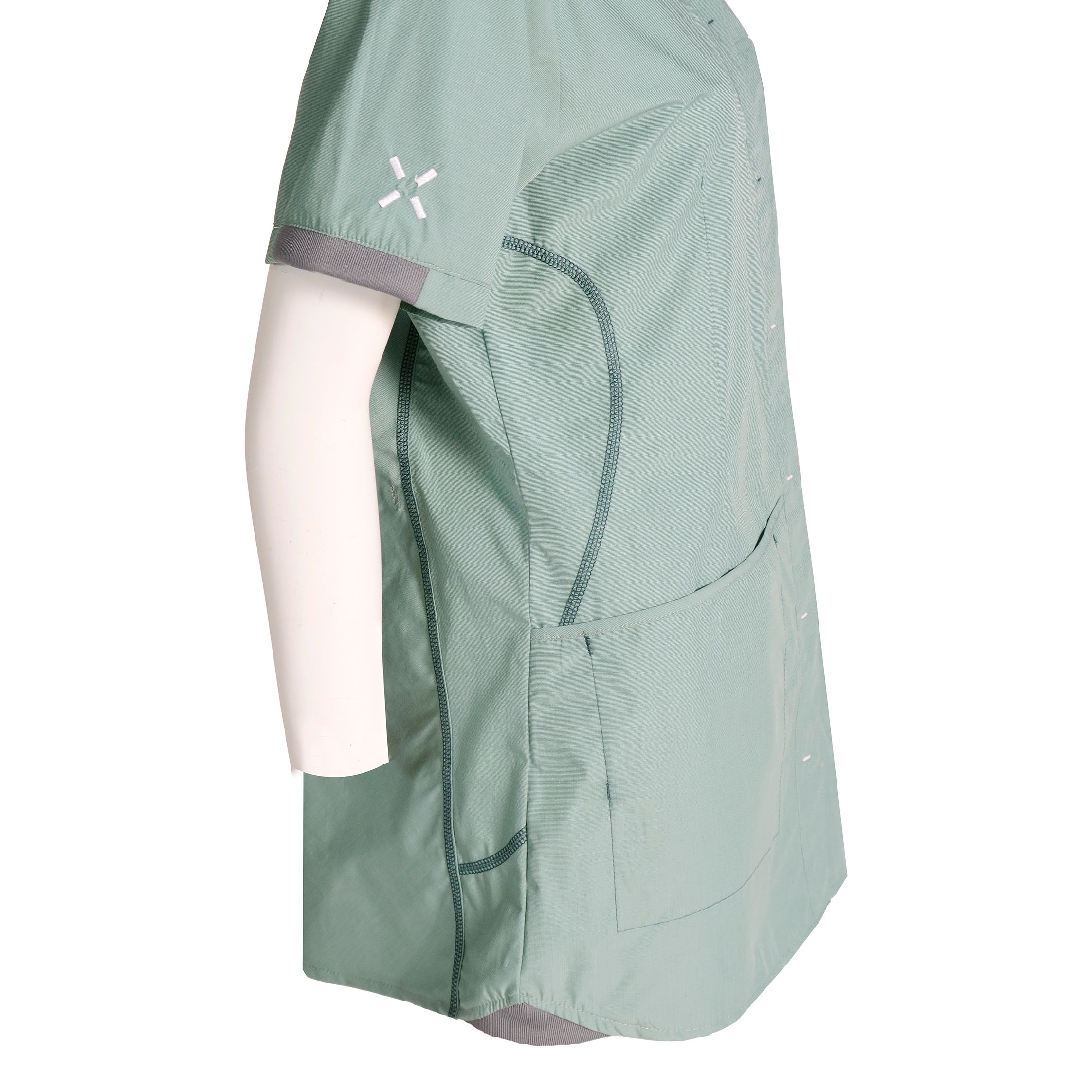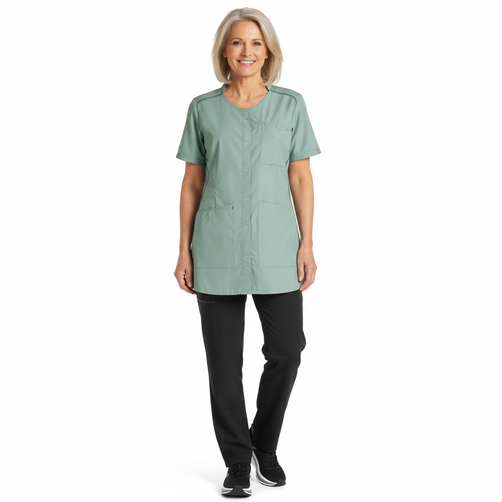 Denne smukke lysegrønne dametunika fra Nybo Workwear A/S er både sporty og funktionel. Tunikaen er let taljeret og kan yderligere justeres i taljen takket være en smart reguleringsfunktion i ryggen. Den kommer med en rummelig brystlomme og to hoftelommer, der begge er udstyret med nøglestropper og integrerede mobillommer, alle med trykknapper for sikker opbevaring.