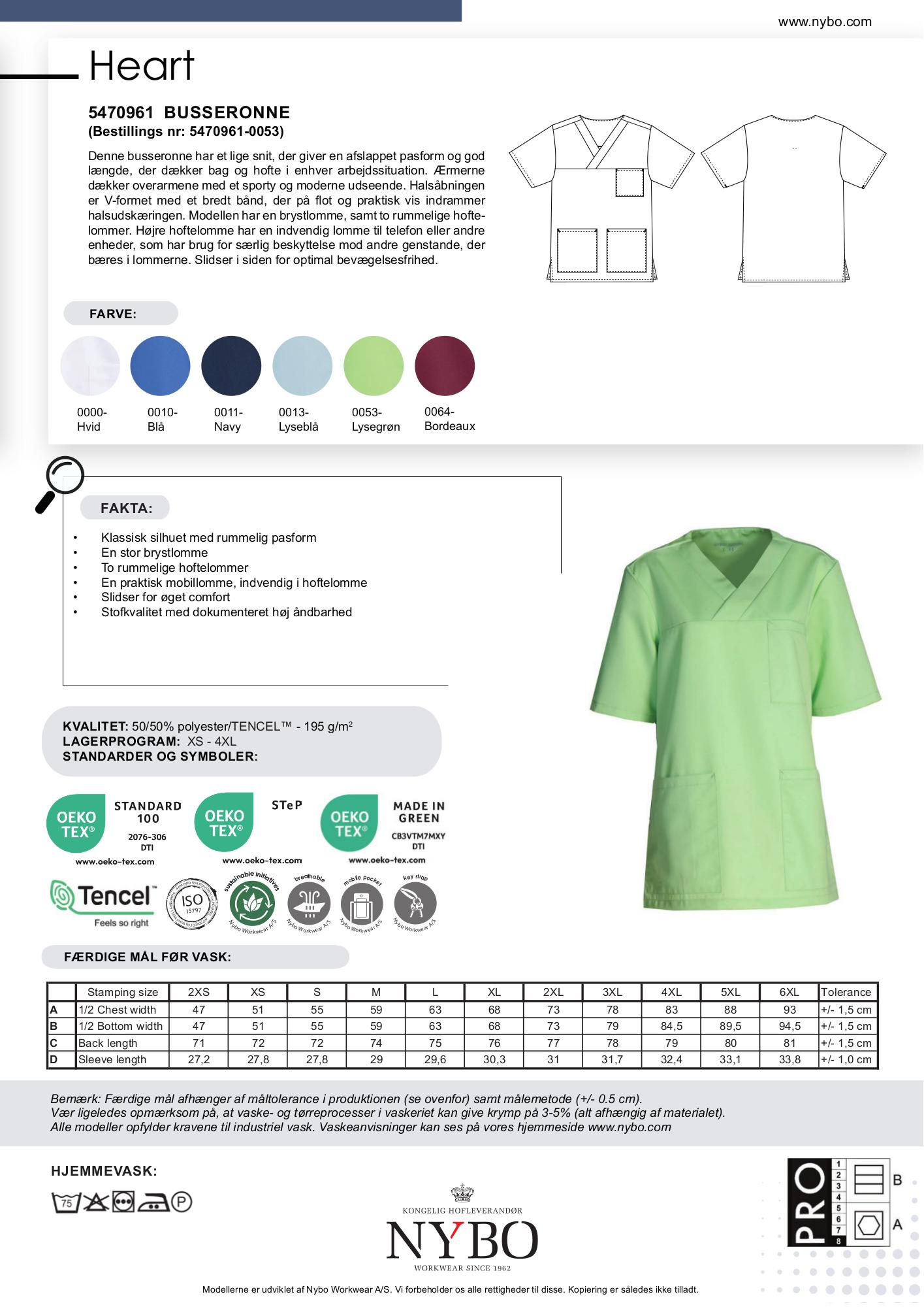 Nybo Workwear A/S præsenterer den alsidige og komfortable Nybo Lysegrøn Unisex HEART Busseronne, der kombinerer funktionalitet med stil. Denne busseronne har et lige snit, som giver en afslappet pasform og er designet til at dække både bag og hofte i enhver arbejdssituation. Med sine sporty og moderne ærmer, der dækker overarmene, og den elegante V-formede halsåbning med bredt bånd, fremstår busseronnen både praktisk og æstetisk.