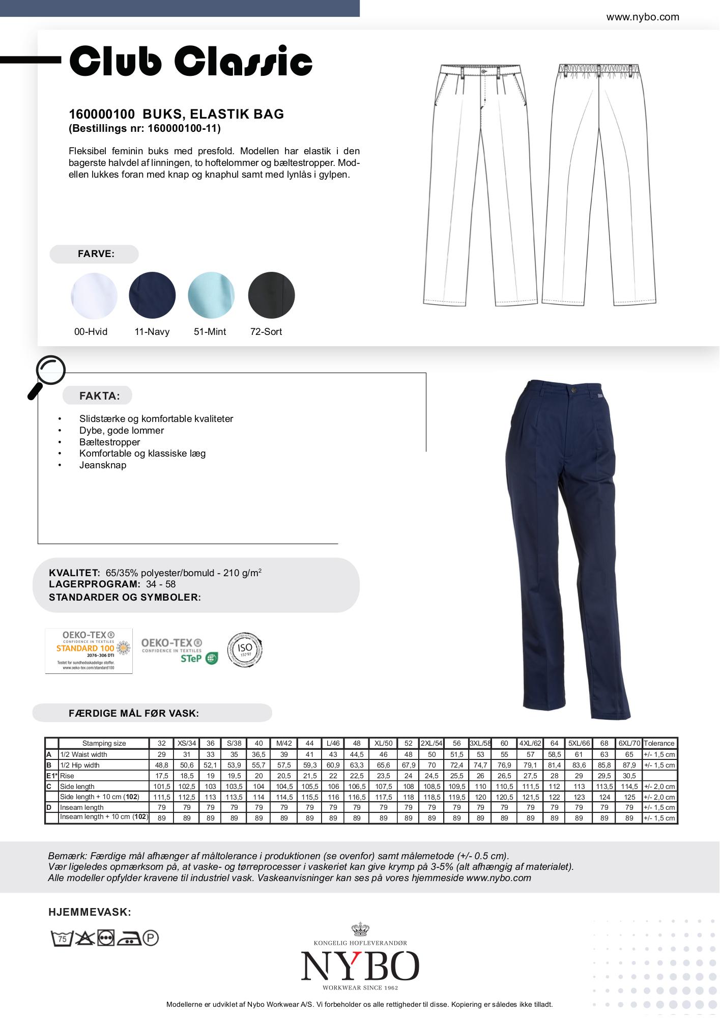 Disse bukser fra Nybo Workwear A/S, også kendt som Nybo Navy Dame Club-Classic Bukser, er skræddersyet til kvinder og præsenterer et klassisk og fleksibelt design. Med elastik i den bagerste del af linningen sikrer de en behagelig og tilpasset pasform. Bukserne har presfold, to praktiske hoftelommer og bæltestropper, hvilket giver både stil og funktionalitet. Foran lukkes de med knap og lynlås i gylpen, hvilket gør dem nemme at tage af og på.
