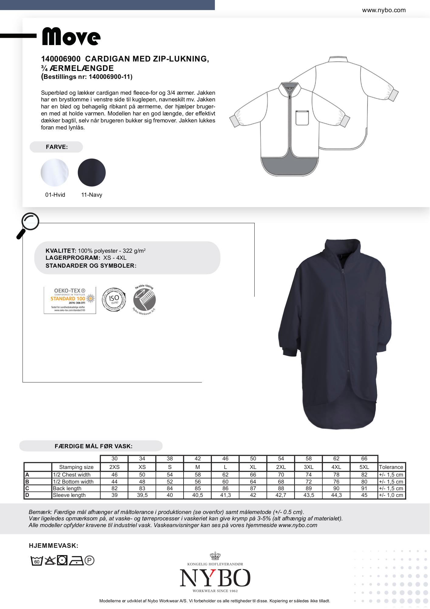 Den moderne jakke har en praktisk længde, som dækker godt selv når du bøjer dig frem, og den lukkes med en robust lynlås, der tåler industriel vask. Uanset om du har den på i navy eller i hvid, kan du være sikker på at få en professionel og stilfuld fremtoning hele dagen.