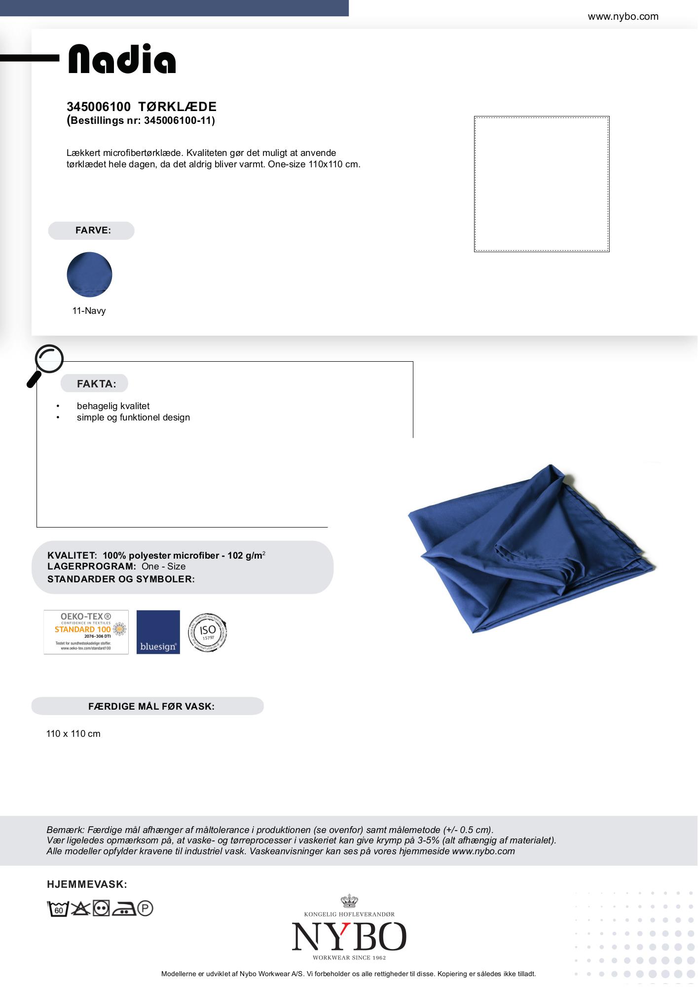 Det lækre og behagelige Nadia-tørklæde fra Nybo Workwear A/S er produceret i en let mikrofiberkvalitet, som sikrer, at det kan bæres hele dagen uden at føles varmt. Tørklædet måler 110×110 cm og er one-size, hvilket gør det til et alsidigt tilbehør for enhver garderobe. Den stilfulde tørklædeserie er designet i en let og komfortabel mikrofiber, der falder smukt over skuldrene og giver et elegant udtryk. Med den klassiske navy farve passer dette tørklæde perfekt til alle anledninger og kan nemt kombineres med forskellige outfits. Lavet af 100% polyester mikrofiber med en vægt på 102 g/m², er dette tørklæde både holdbart og let at vedligeholde.