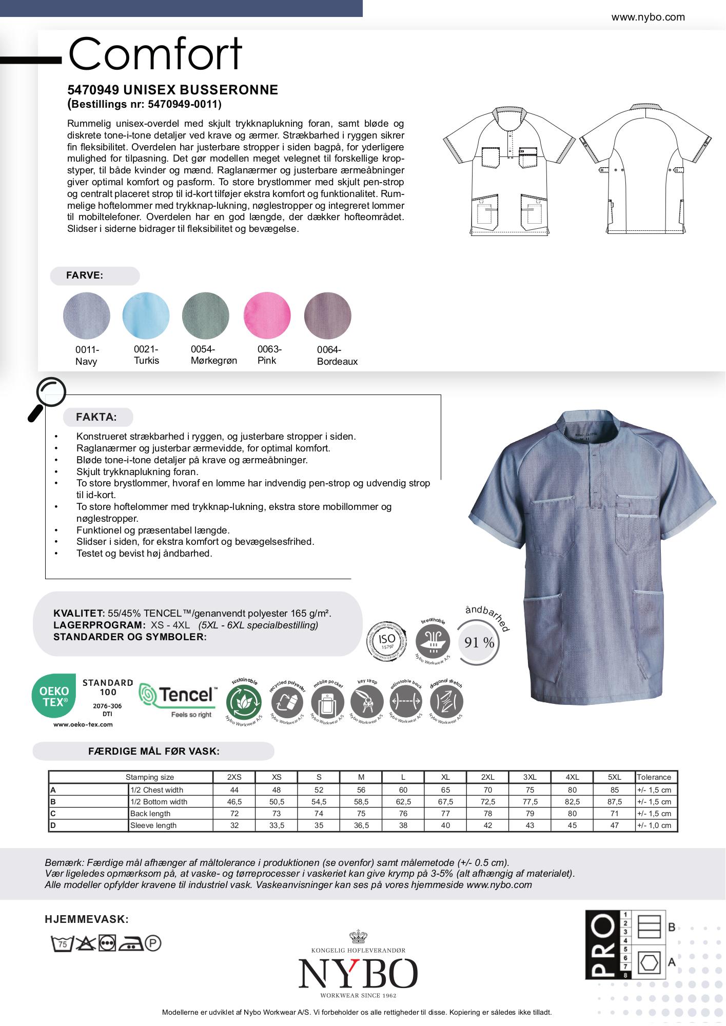 Nybo Navy Unisex Comfort Busseronnen fås også i følgende farver: Turkis, Mørkegrøn, Pink og Bordeaux. Materialet består af 55% TENCEL™ og 45% genanvendt polyester, og vejer 165 g/m².