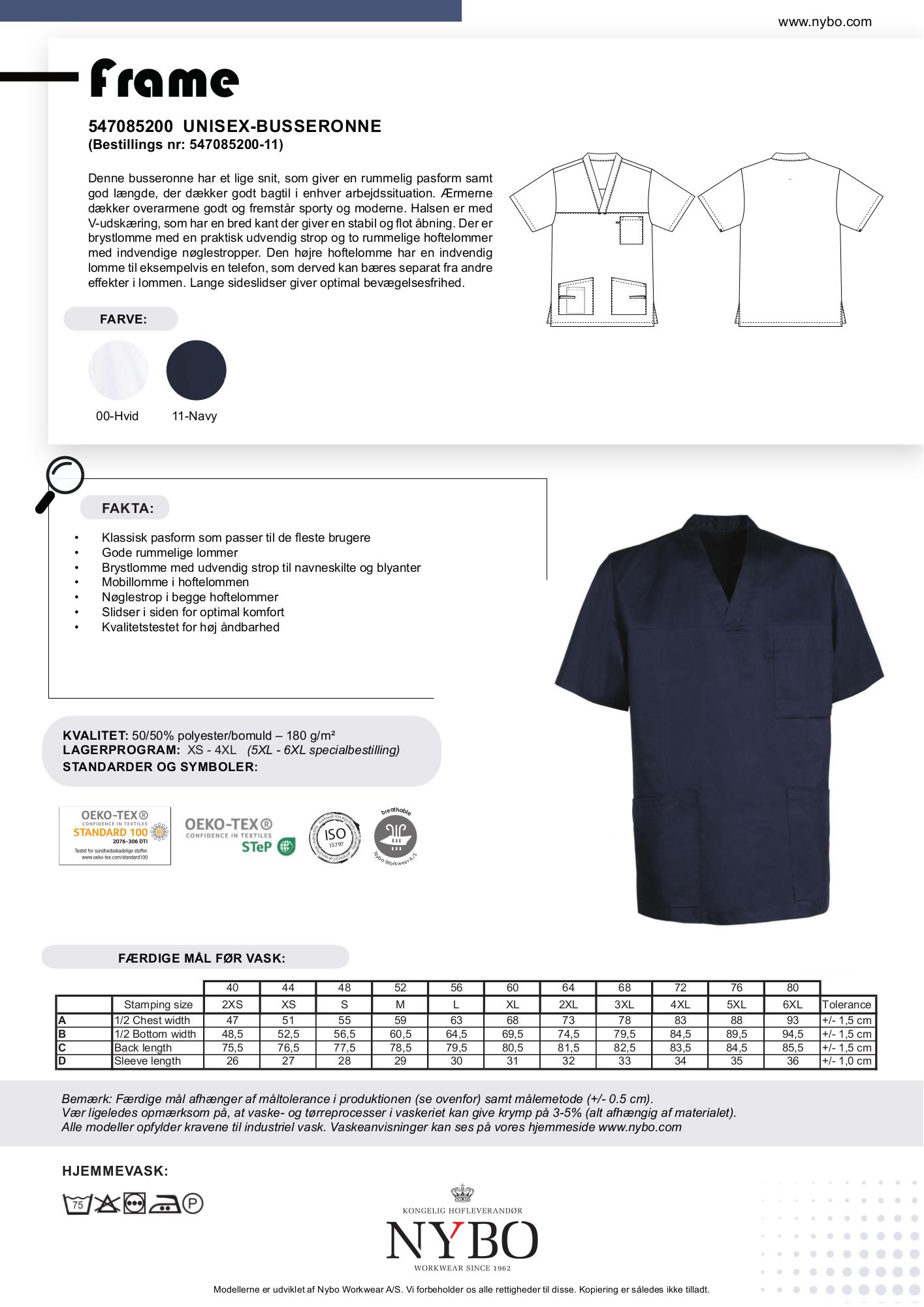 Nybo Workwear A/S præsenterer en alsidig Nybo Navy Unisex Frame Busseronne, designet til at være komfortabel, åndbar og med et lige snit. Denne busseronne byder på en rummelig pasform og en god længde, der sikrer, at du er godt dækket i enhver arbejdssituation. Ærmerne dækker overarmene effektivt og fremstår sporty og moderne. Den V-formede halsudskæring med en bred kant skaber en stabil og elegant åbning. Busseronnen har en praktisk brystlomme med en udvendig strop og to rummelige hoftelommer med indvendige nøglestropper. Den højre hoftelomme inkluderer en indvendig lomme perfekt til at opbevare en telefon adskilt fra andre nødvendigheder. Lange sideslidser sikrer optimal bevægelsesfrihed.