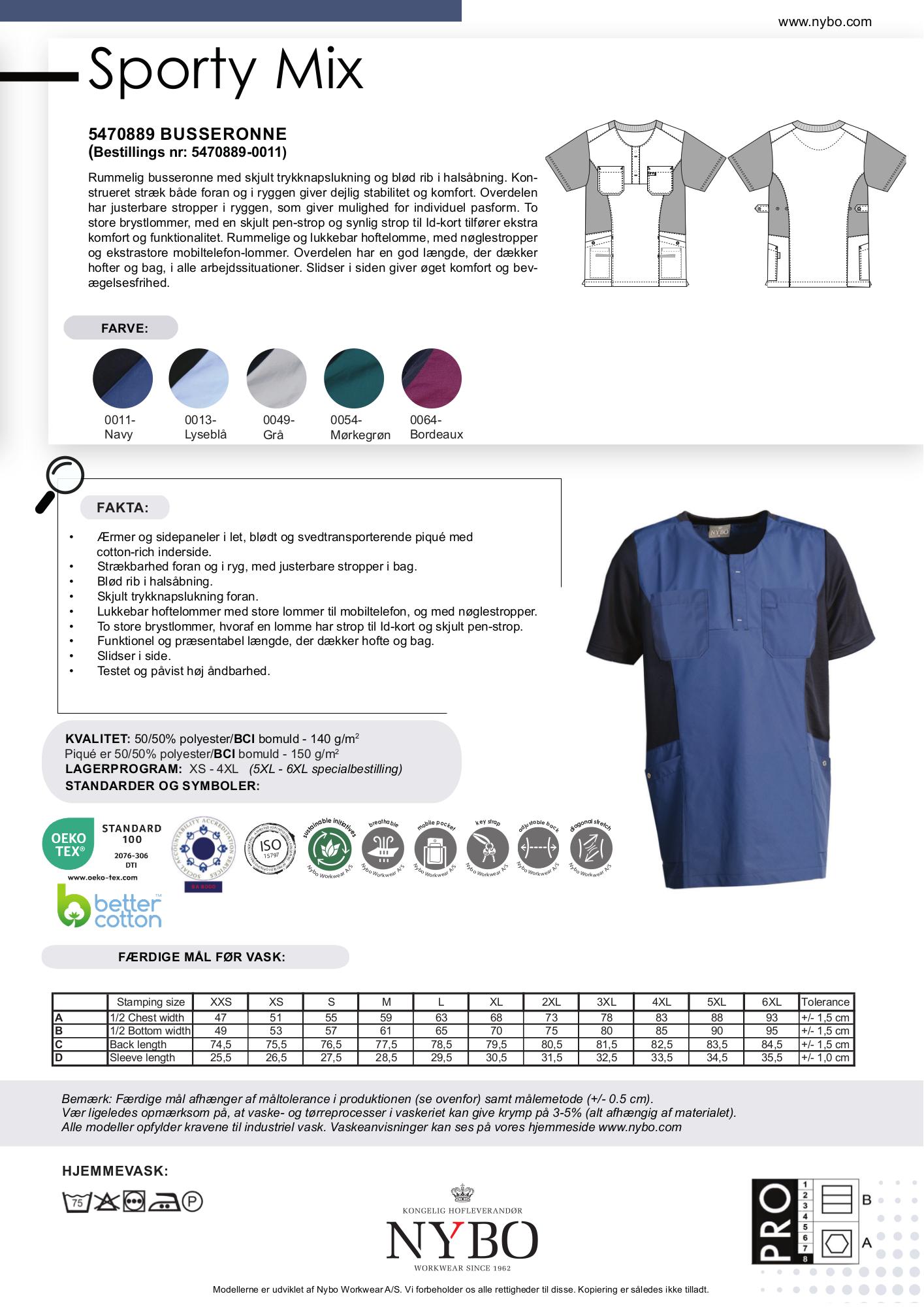Foruden Navy er denne busseronne tilgængelig i farverne Lyseblå, Grå melange, Mørkegrøn og Bordeaux, hvilket giver mulighed for at finde den perfekte nuance, der matcher personlige præferencer eller arbejdsmiljøet. Med en sammensætning af 50% polyester og 50% BC-bomuld, leverer den både holdbarhed og komfort.
