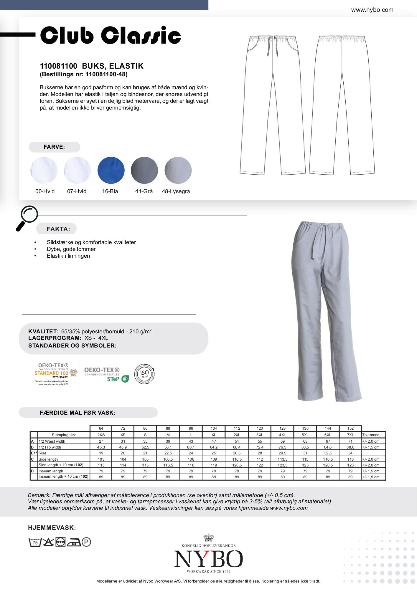 Nybo Pale Grey Damebuks fra Club-Classic serien er designet til at give optimal komfort og stil. Bukserne udmærker sig ved deres elastiske talje og praktiske bindebånd, der sikrer en god pasform og funktionalitet for både kvinder og mænd. Den bløde metervare kombinerer polyester og bomuld for at give en behagelig og holdbar overflade, samtidig med at modellen er diskret og ikke gennemsigtig.