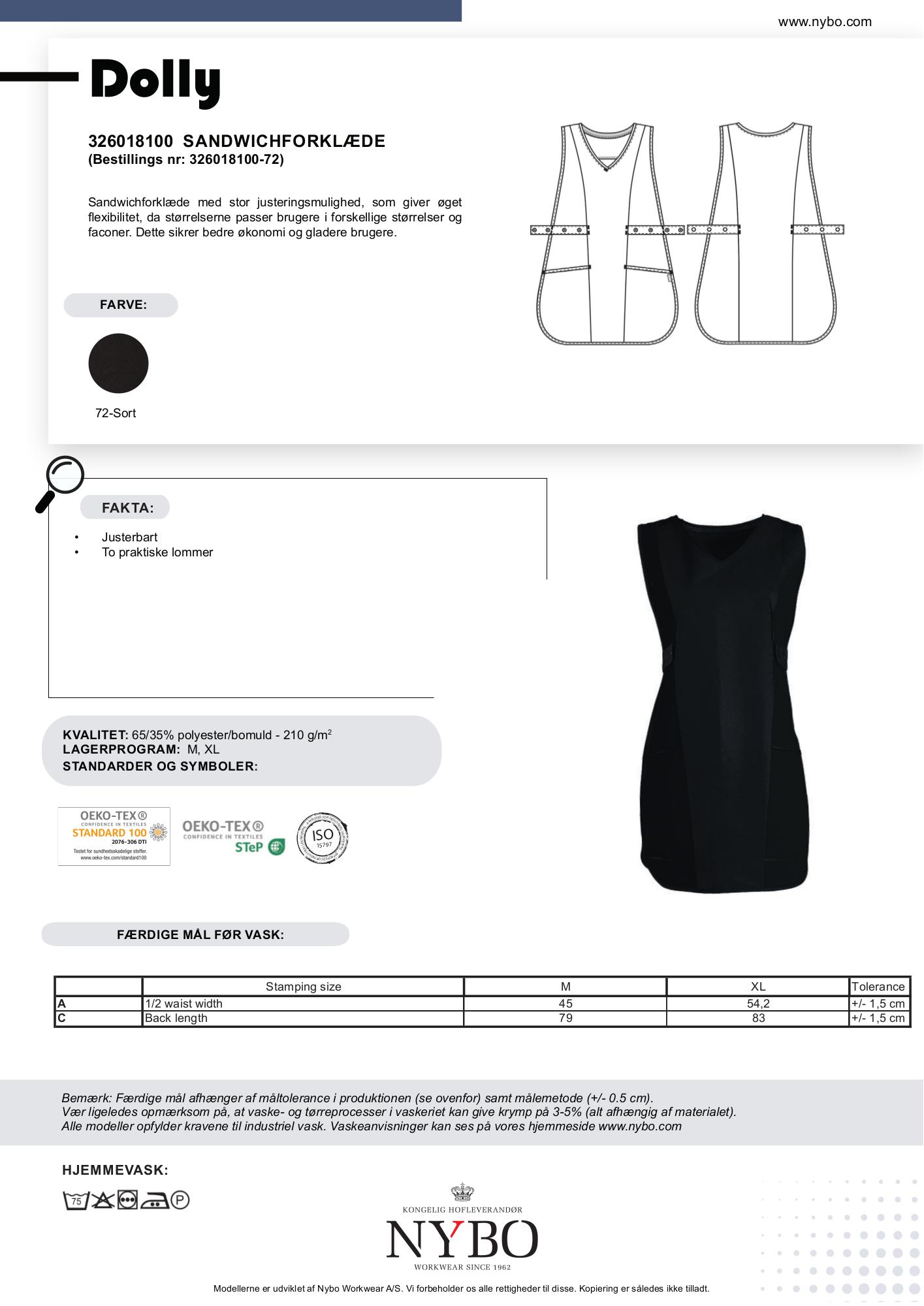 Oplev den ultimative fleksibilitet og komfort med Nybo’s unisex Dolly forklæde i sort. Dette sandwichforklæde er designet til at passe brugere af forskellige størrelser og faconer takket være dets store justeringsmuligheder. Dette sikrer ikke kun en perfekt pasform, men også bedre økonomi og gladere brugere. Materialet består af en holdbar blanding af 65% polyester og 35% bomuld med en vægt på 210 g/m².