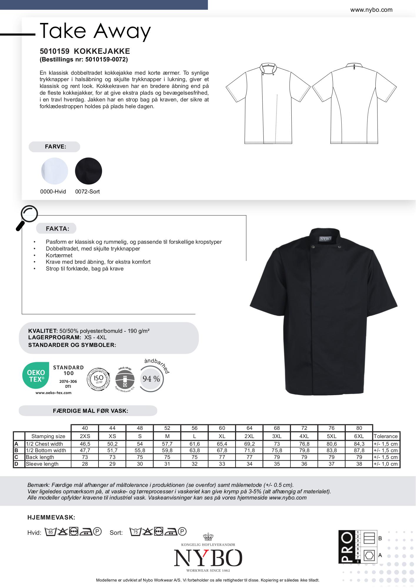 Nybo Workwear tilbyder den stilfulde og komfortable Nybo Sort Unisex Take Away Kokkejakke med korte ærmer, der er designet til både mænd og kvinder. Denne jakke er perfekt til travle kokke og køkkenpersonale, da den er udstyret med en klassisk dobbeltknappet konstruktion med skjulte trykknapper. Den har også en bredere kraveåbning for ekstra komfort og bevægelsesfrihed. En praktisk strop bag på kraven holder forklædestroppen sikkert på plads hele dagen. Jakken har en rummelig og klassisk pasform, der passer til mange kropstyper.