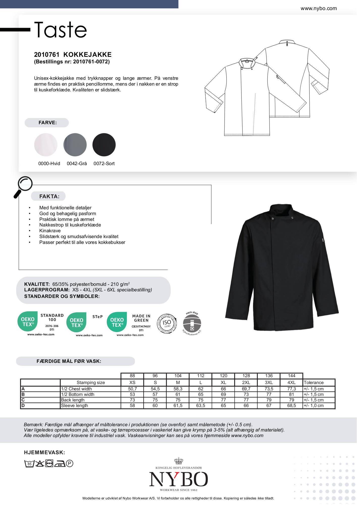 Nybo Workwear A/S præsenterer denne slidstærke unisex kokkejakke, der er designet til både stil og funktionalitet. Den lange ærmede kokkejakke er udstyret med praktiske trykknapper og en nyttig pencillomme på venstre ærme. Desuden findes der en strop i nakken til fastgørelse af kuskeforklæde, hvilket gør denne jakke både praktisk og bekvem. Fremstillet af et holdbart polyester/bomulds-mix med en vægt på 210 g/m², sikrer denne jakke optimal komfort og modstandsdygtighed mod smuds og slitage.