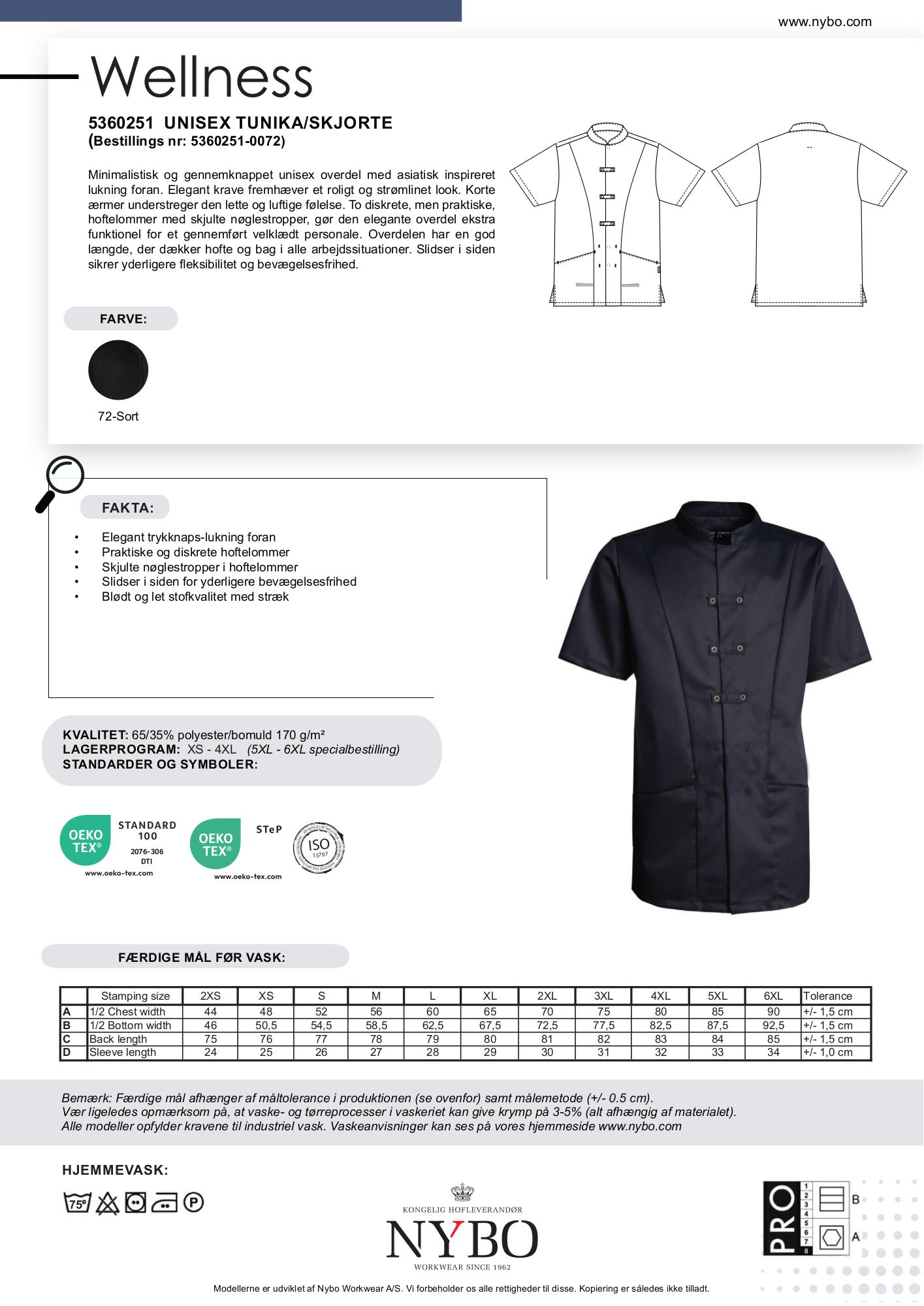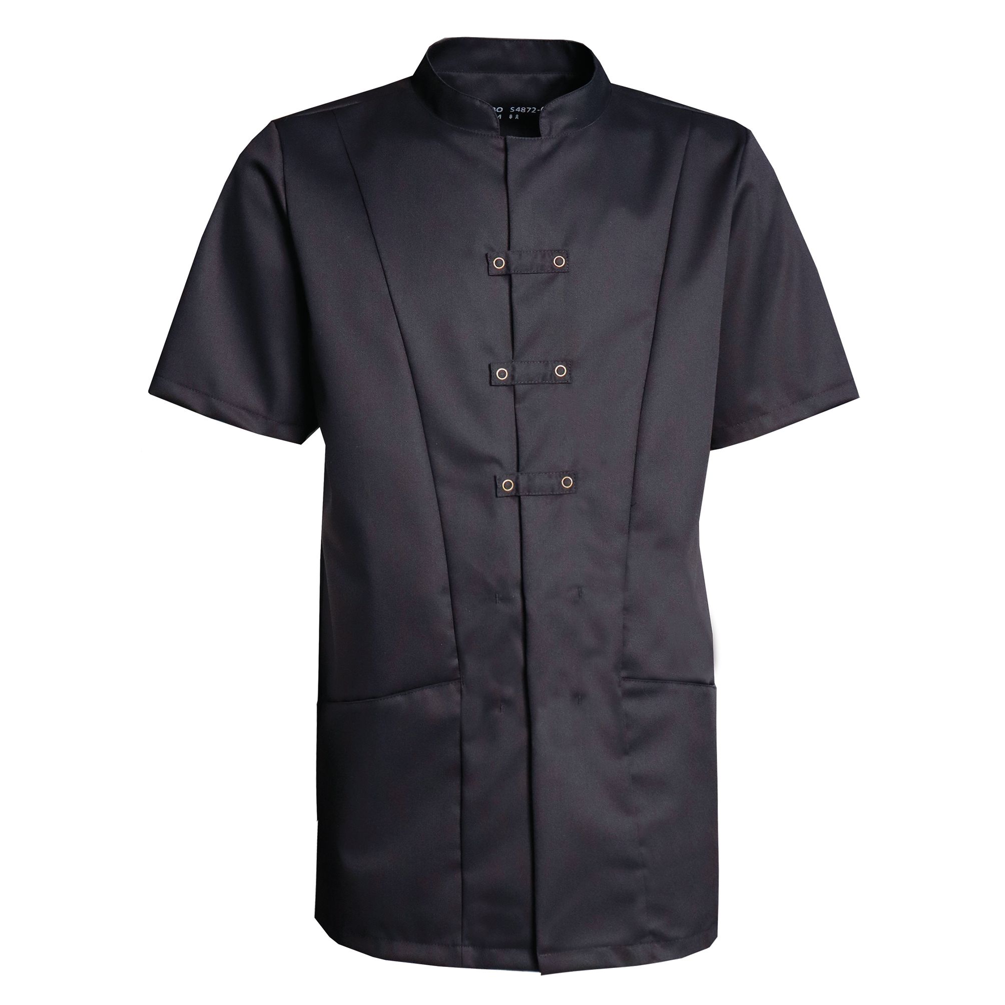 Nybo Workwear A/S har designet denne stilfulde sorte unisex wellness skjorte med korte ærmer og stræk. Denne minimalistiske busseronne er gennemknappet og har en asiatisk inspireret lukning foran, der tilføjer et strejf af elegance. Den elegante krave bidrager til et roligt og strømlinet udseende, mens de korte ærmer giver en let og luftig følelse, der er perfekt til travle arbejdsdage. Udstyret med to diskrete hoftelommer, der indeholder skjulte nøglestropper, giver denne overdel ekstra funktionalitet og bekvemmelighed. Den er designet til at dække hofter og bag, hvilket sikrer et professionelt udseende i alle situationer. Slidserne i siden sørger yderligere for fleksibilitet og bevægelsesfrihed, hvilket gør denne skjorte ideel for velklædt personale.