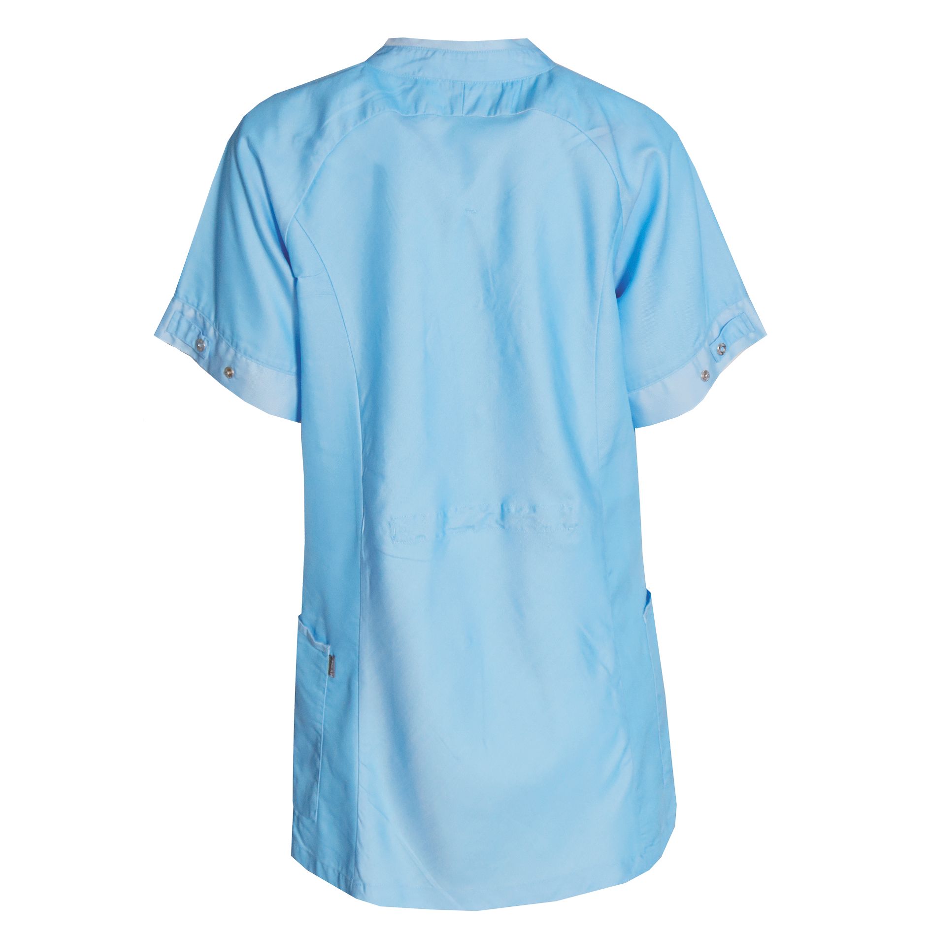 Nybo Turkis Dame Comfort Tunika tilbyder professionel komfort og stil til servicepersonale og plejepersonale. Denne let taljerede tunika har en gennemknappet front med skjult trykknaplukning og bløde tone-i-tone detaljer på både krave og ærmer. Den indbyggede strækbarhed i ryggen og den skjulte justering i taljen bagpå sikrer en perfekt pasform til forskellige kropstyper. Raglanærmer med justerbar ærmevidde garanterer optimal komfort og bevægelsesfrihed.