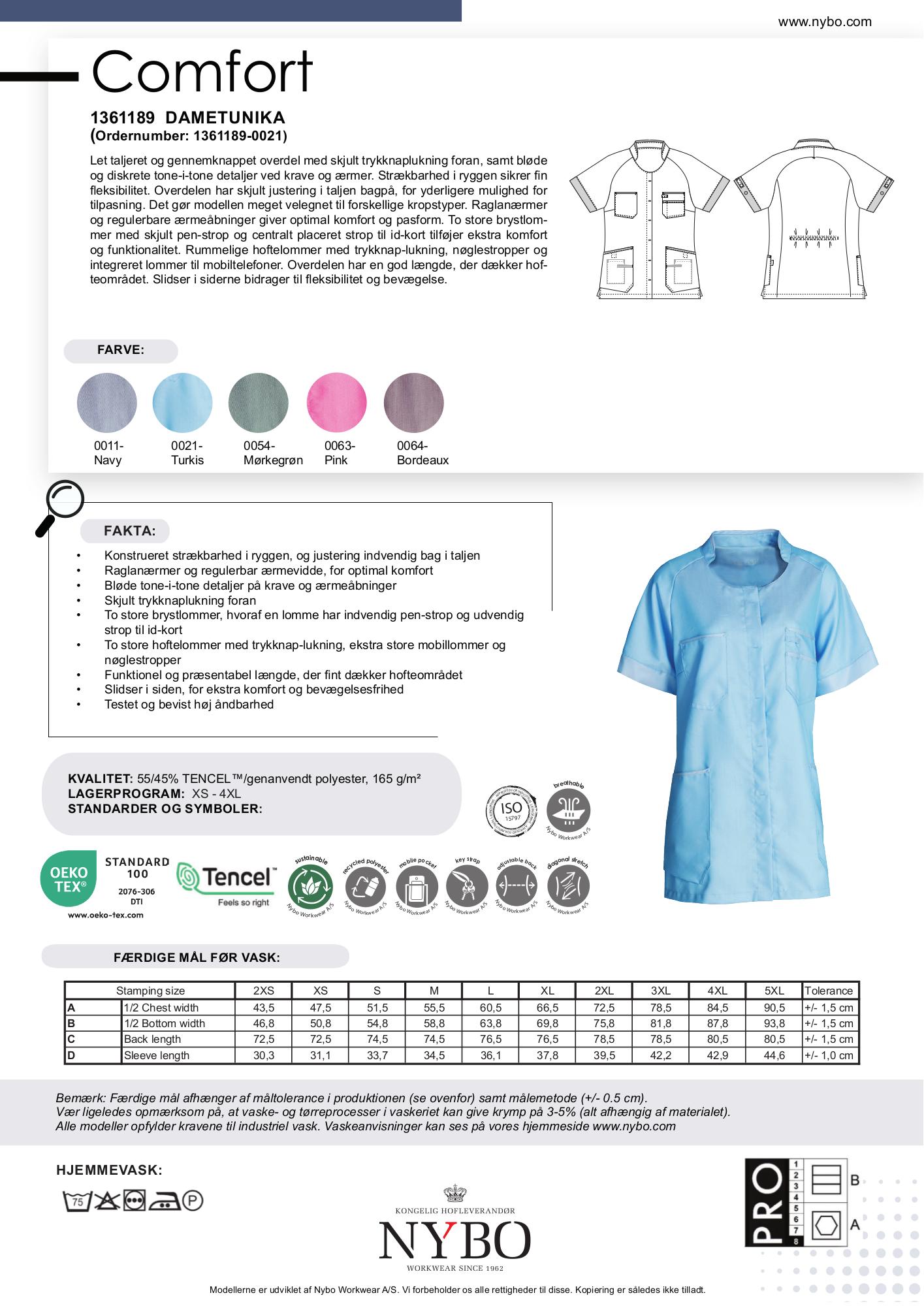 Nybo Dame Comfort Tunika fås også i farverne navy, mørkegrøn, pink og bordeaux, der alle fremhæver et professionelt udseende. Tilgængelige størrelser: XS, S, M, L, XL, 2XL, 3XL, 4XL. Der er merpris på 15% for overstørrelser 2XL og op.