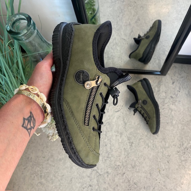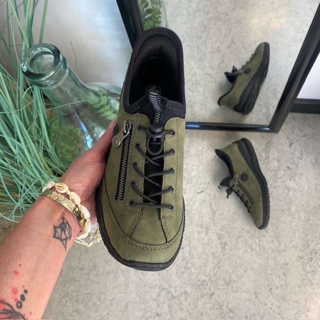 Olivengrøn Rieker slip-on sneakers til damer tilbyder en perfekt kombination af stil og funktionalitet.