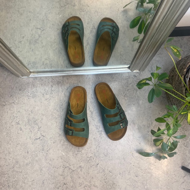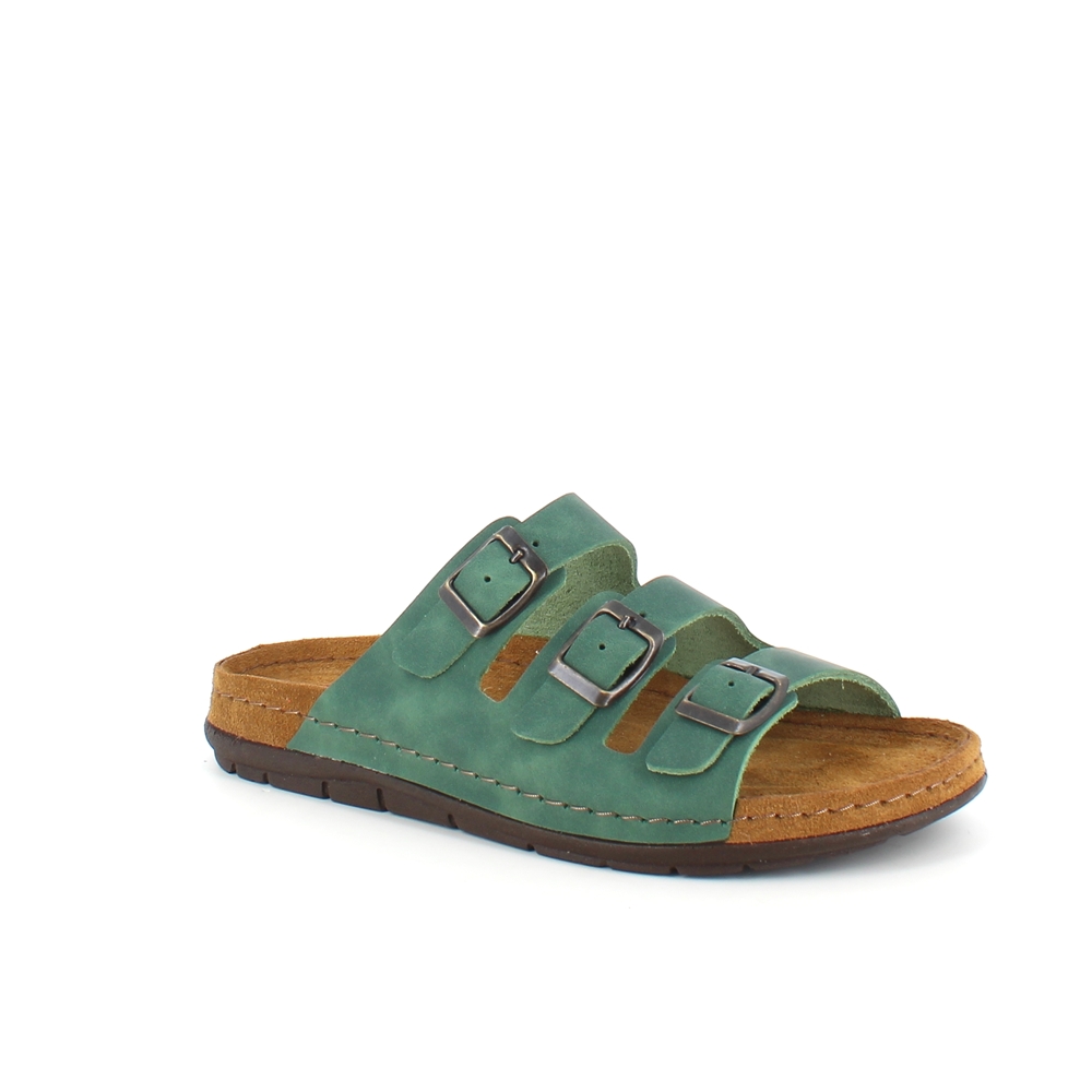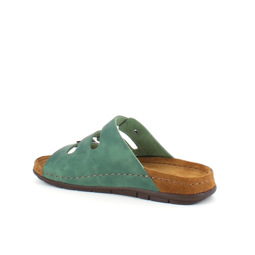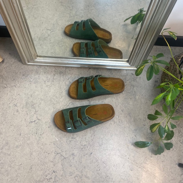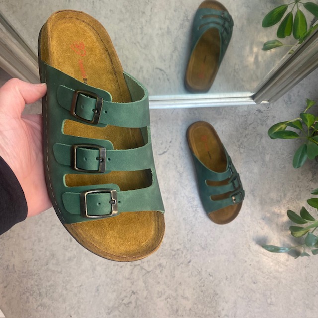Lækker olivengrøn slip-on sandal i skind med tre smalle, justerbare remme. Indersålen har en blød skumsål, der er dækket af ruskind, som strækker sig over mellemsålen for et ekstra touch. Ydersålen har yderligere polstring ved hælen og er ekstremt fleksibel. En virkelig luksuriøs og veludført slip-on sandal. Denne sandal fås i størrelserne 37-42 og fås i flere farver.