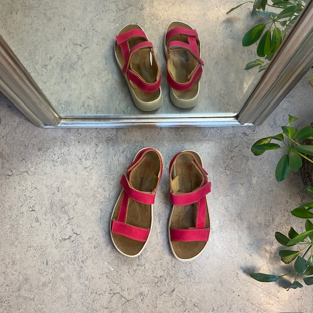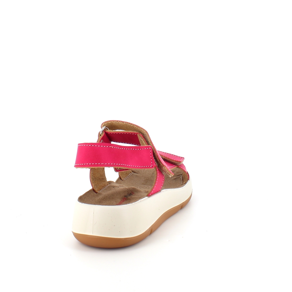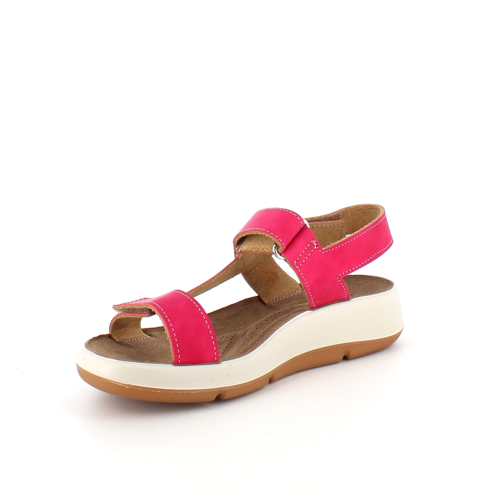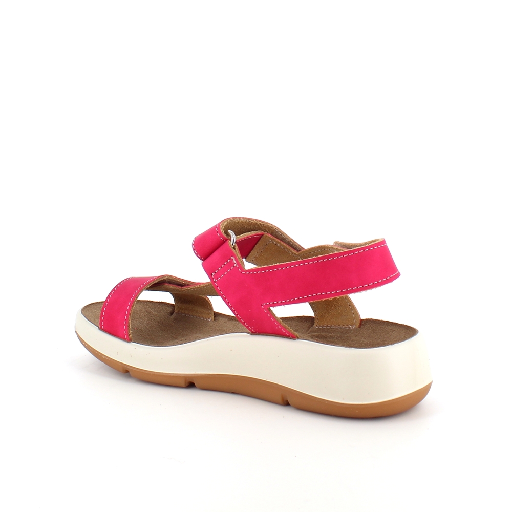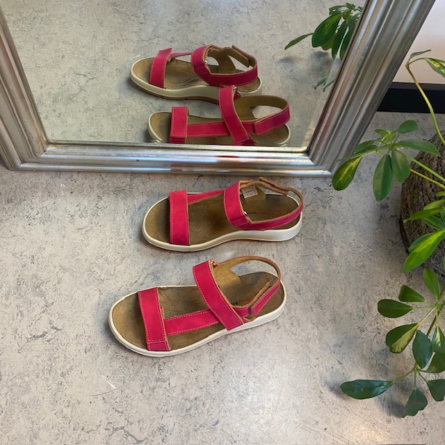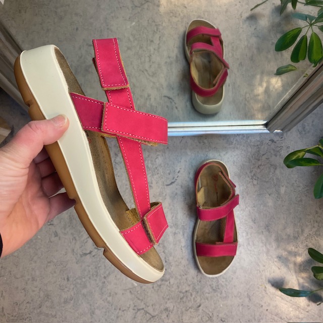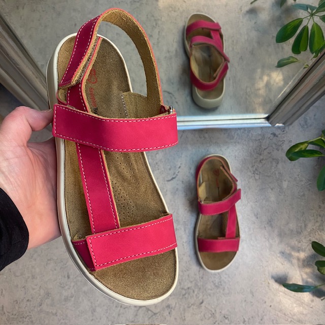 Sandal med pink farvet skindremme, som kan indstilles både ved forfoden, anklen og bag hælen.